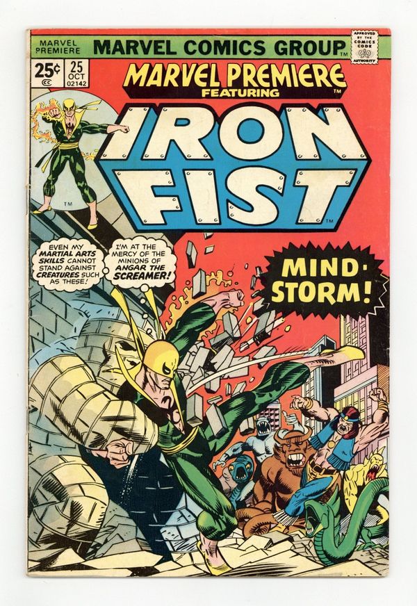 Tags: Martial Arts$21.50Cover pencils by Gil Kane, inks by Dan Adkins. Morning of the Mindstorm!, script by Chris Claremont, pencils by John Byrne, inks by Al McWilliams; Iron Fist arrives at the Wings to discover Colleen missing and Lee raving like a mad man; Danny and Scarfe try to track down Colleen but are assaulted by illusions courtesy of Angar; Beating Angar down, Iron Fist discovers a Stark International i.d. card on the villain and figures the company is behind the disappearance of his friend. Continued in Iron Fist (Marvel, 1975 series) #1. The letters page contains Marvel Value Stamp series A # 6 (Thor by John Buscema). 36 pgs. $0.25. Cover price $0.25.