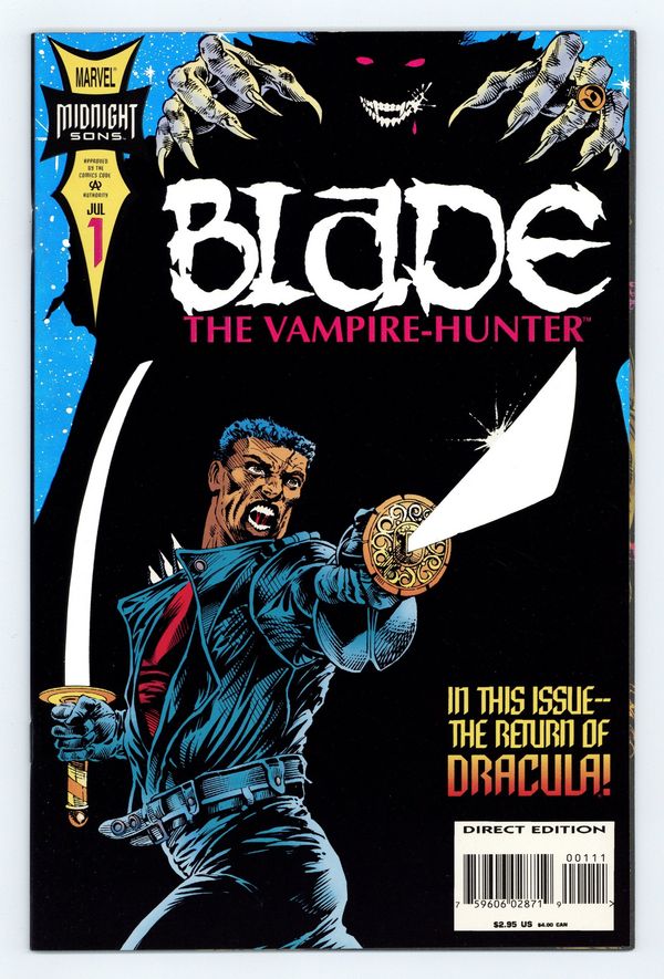 The other Nightstalkers are dead, and Blade stands alone against the vampires invading the Marvel Universe! Among them is Dracula, and the devastating means of his return is beyond your wildest nightmares! Written by Ian Edginton. Art by Doug Wheatley and Chris Ivy. Foil-stamped cover. Cover price $2.95.