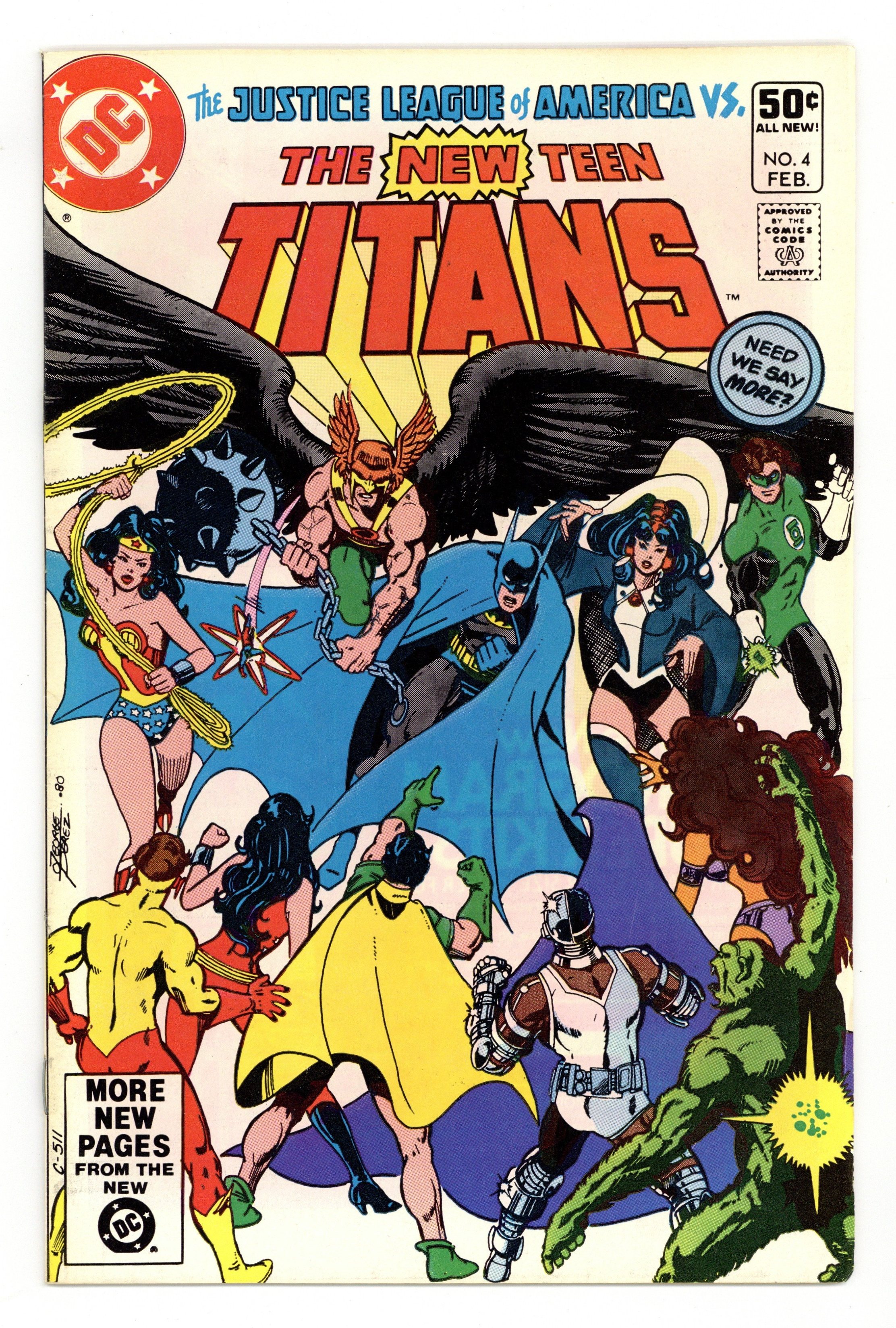 Direct Edition. The Titans battle the JLA in their satellite, while Trigon and the Fearsome Five continue to threaten in "Against All Friends!" Script by Marv Wolfman, pencils by George Perez, inks by Romeo Tanghal. Perez cover. Cover price $0.50.