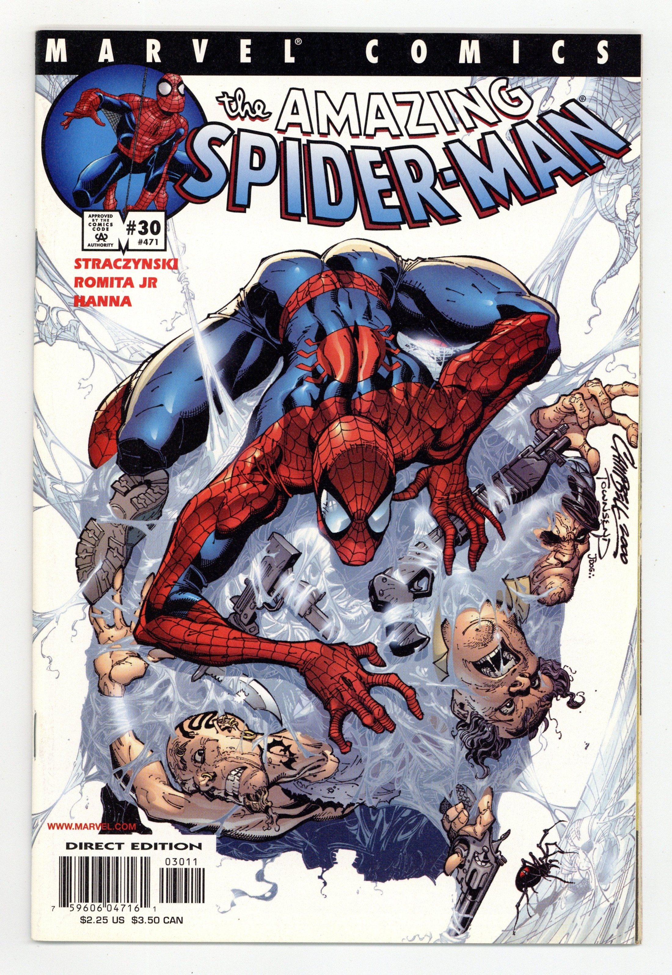 Tags: Marvel Legacy Numbering: Amazing Spider-Man (part 471), Spider-Man$30.00Cover by J. Scott Campbell. Story by J. Michael Straczynski, art by John Romita Jr. THE SCOOP: A new era unfolds as acclaimed writer J. Michael Straczynski takes the reins of Marvel's flagship character! THE STORY: As Peter Parker gets back into the swing of his life, a sudden encounter with an enigmatic stranger will forever change the way he will look at himself? And his alter ego, the ever-amazing Spider-Man. THE CREATORS: He's launched two hits with Rising Stars and Midnight Nation, and now Straczynski teams up with penciler John Romita Jr. to form the Spidey dream team supreme! And can you believe we have none other than J. Scott Campbell on covers? THE FORMAT: 36 pages, full color, with ads. Cover price $2.25.