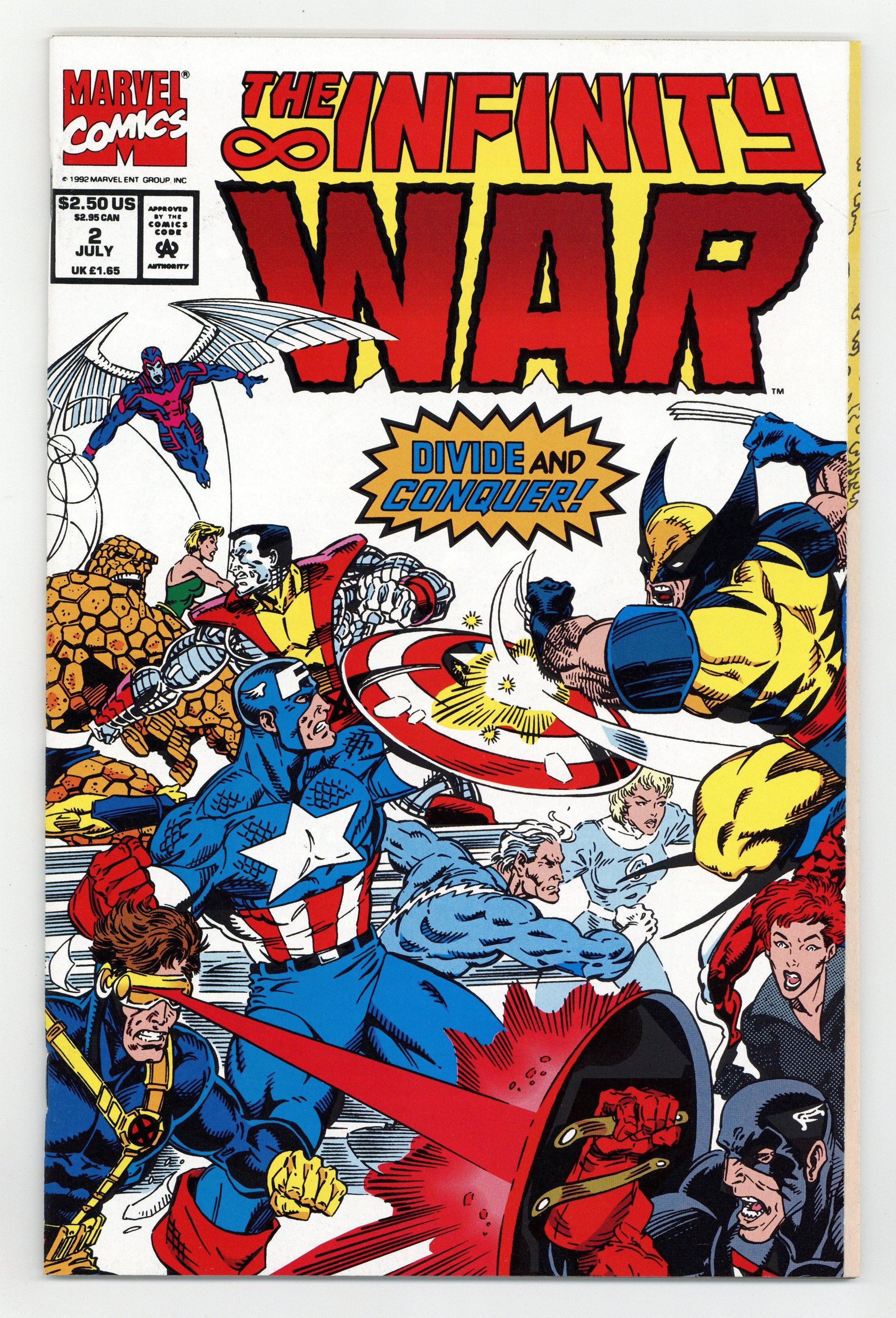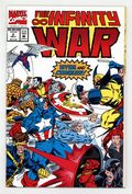 Tags: Infinity War (1992) (part 2)$10.00Story by Jim Starlin. Art by Ron Lim and Al Milgrom. The Avengers, Fantastic Four, X-Men, X-Factor, Alpha Flight, Daredevil, Hulk, Moon Knight, and the New Warriors have all gathered at the behest of Reed Richards. Meanwhile, Galactus, Silver Surfer, Nova, and Dr. Strange investigate a mystical disturbance, followed in the shadows by the nefarious duo Dr. Doom and Kang. Thanos, Adam Warlock and the Infinity Watch pay a visit to Mistress Death to discover a startling revelation. Plus, when the volatile mutant Wolverine accuses Reed Richards of being an imposter the tensions between the mutant heroes and the others escalates into a battle royal. Then, the evil-Reed doppleganger springs his trap as a gamma bomb explodes. Story by Jim Starlin. Art by Ron Lim and Al Milgrom. 48 pages. Cover price $2.50.