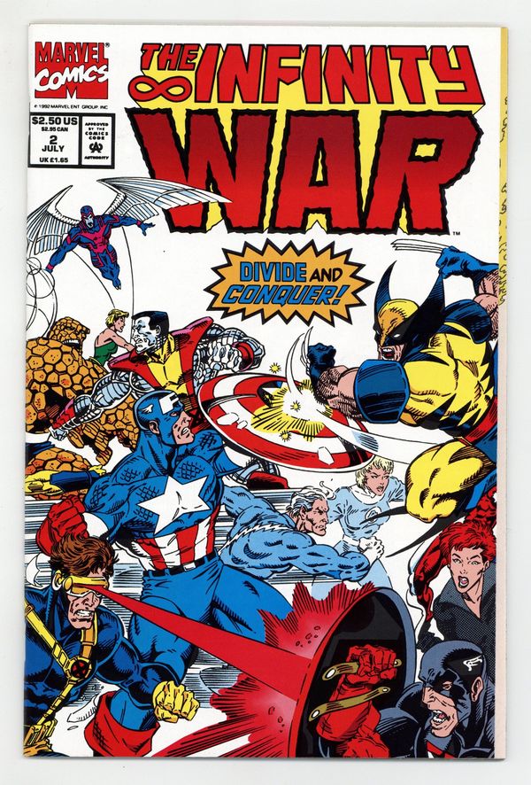 Story by Jim Starlin. Art by Ron Lim and Al Milgrom. The Avengers, Fantastic Four, X-Men, X-Factor, Alpha Flight, Daredevil, Hulk, Moon Knight, and the New Warriors have all gathered at the behest of Reed Richards. Meanwhile, Galactus, Silver Surfer, Nova, and Dr. Strange investigate a mystical disturbance, followed in the shadows by the nefarious duo Dr. Doom and Kang. Thanos, Adam Warlock and the Infinity Watch pay a visit to Mistress Death to discover a startling revelation. Plus, when the volatile mutant Wolverine accuses Reed Richards of being an imposter the tensions between the mutant heroes and the others escalates into a battle royal. Then, the evil-Reed doppleganger springs his trap as a gamma bomb explodes. Story by Jim Starlin. Art by Ron Lim and Al Milgrom. 48 pages. Cover price $2.50.