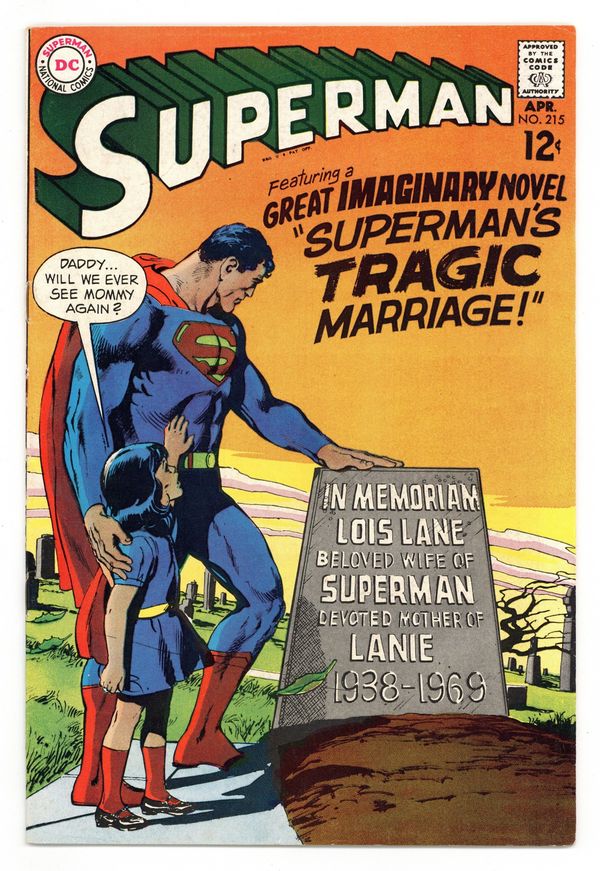 Tags: Superman$26.00Cover art by Neal Adams. Lois Lane... Dead... Yet Alive, script by Otto Binder, pencils by Curt Swan, inks by Jack Abel; Superman marries Lois Lane only to have the very thing he most fears happen--Lois is killed by a super enemy; Superman and his young daughter must cope with life without Lois. Superman's First Exploit, script by Edmond Hamilton, pencils by Wayne Boring, inks by Stan Kaye; a classic reprint retelling the story of Superbaby's very first adventure, one that occurred during his transit from Krypton to Earth. 36 Pages, Full Color. Cover price $0.12.