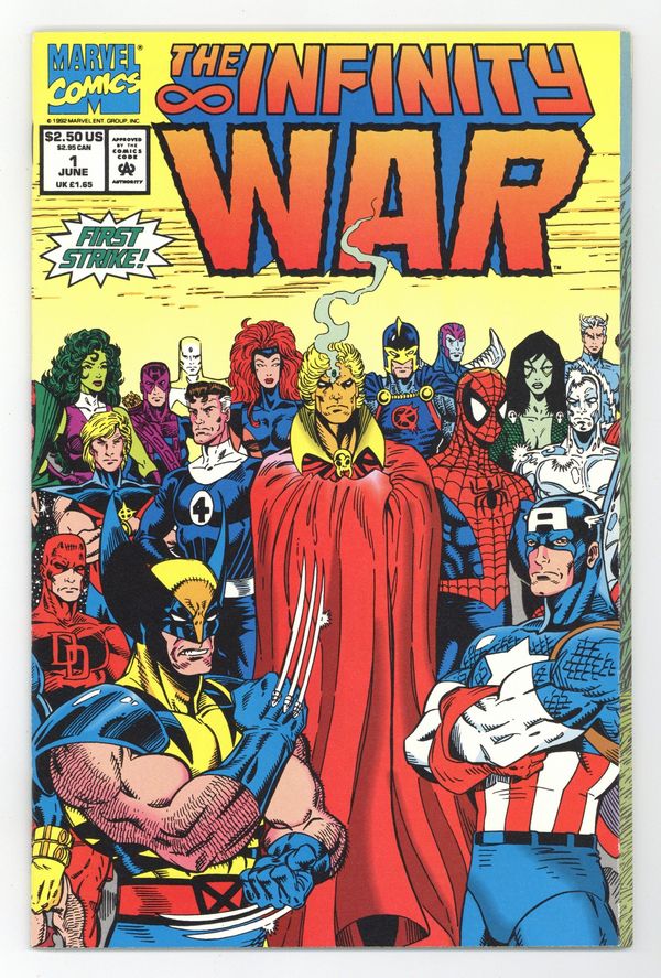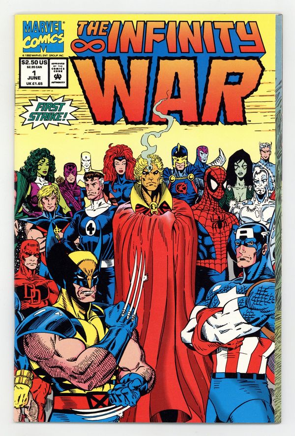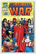 Tags: Infinity War (1992) (part 1)$9.00Story by Jim Starlin. Art by Ron Lim and Al Milgrom. The sequel to Infinity Gauntlet. Somewhere deep in space on a nameless planet the titan Thanos discovers a new threat to the existence of the universe and investigates. Meanwhile, all across the globe key super-heroes are attacked by evil dopplegangers. Thanos comes face to face with the ones responsible, the Magus, evil counterpart to Adam Warlock, and the titan's own doppleganger. As Reed Richards gathers the world's heroes the World Devourer Galactus sends his herald to contact the Master of the Mystic Arts, Dr. Strange. All this plus the unholy alliance of Dr. Doom and Kang the Conqueror. Story by Jim Starlin. Art by Ron Lim and Al Milgrom. 48 pages. Cover price $2.50.