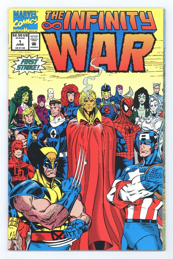 Tags: Infinity War (1992) (part 1)$10.00Story by Jim Starlin. Art by Ron Lim and Al Milgrom. The sequel to Infinity Gauntlet. Somewhere deep in space on a nameless planet the titan Thanos discovers a new threat to the existence of the universe and investigates. Meanwhile, all across the globe key super-heroes are attacked by evil dopplegangers. Thanos comes face to face with the ones responsible, the Magus, evil counterpart to Adam Warlock, and the titan's own doppleganger. As Reed Richards gathers the world's heroes the World Devourer Galactus sends his herald to contact the Master of the Mystic Arts, Dr. Strange. All this plus the unholy alliance of Dr. Doom and Kang the Conqueror. Story by Jim Starlin. Art by Ron Lim and Al Milgrom. 48 pages. Cover price $2.50.