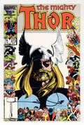 Direct Edition. Marvel 25th Anniversary Cover by Walt Simonson and John Romita (border). "The Gift of Death," script by Walt Simonson, art by Sal Buscema; Thor returns to Midgard and tries to pick up the pieces of his life there; After a rousing afternoon with his boss's children, he is warned by his old allies, the Frogs, that something is amiss underground; Venturing into the Morlock tunnels, Thor happens across the Marauders killing the former X-Man, Angel. Continued from X-Factor #11; Mutant Massacre crossover. Bullpen Bulletins. 36 pgs., full color. $0.75. Cover price $0.75.