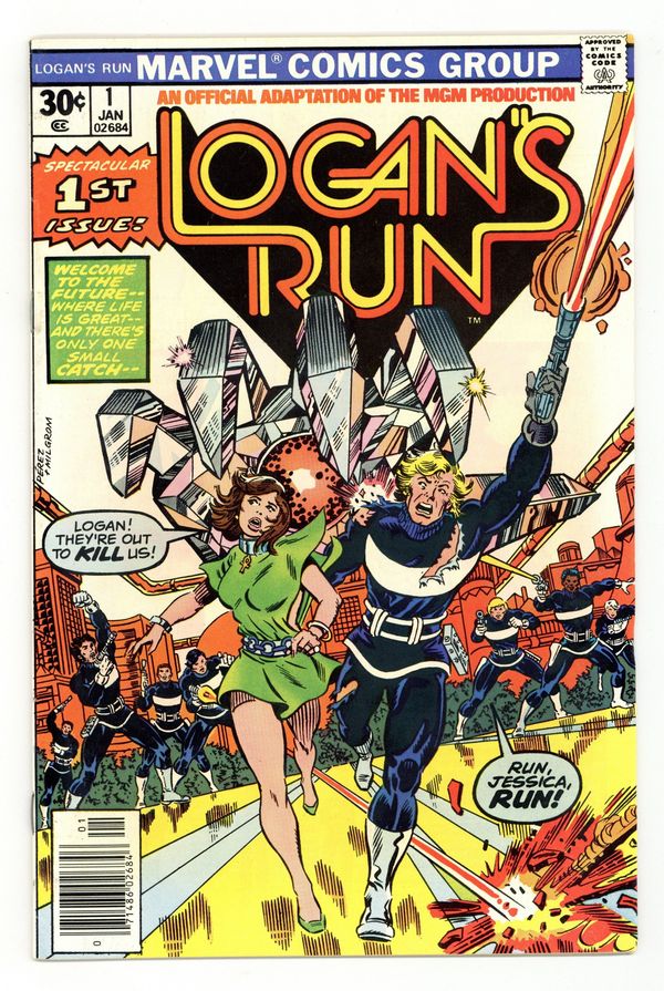 $8.00Cover by George Perez and Al Milgrom. "Logan's Run, Part 1". Part 1 of 5. Story by Gerry Conway (from the screenplay by David Zelag Goodman which was based on the novel by George Clayton Johnson and William F. Nolan). Pencils by George Perez. Inks by Klaus Janson. Welcome to the 23rd century, where life is perfect. There's just one catch. At birth everyone is implanted with a life jewel in their palm. When they reach the age of thirty, the jewel informs them they must report for termination. Not everyone accepts this however. Some choose to run. That's where Logan comes in. Logan is a Sandman, charged with terminating those who do not submit willingly. Everything changes when Logan meets Jessica and learns the secret of the Ankh she wears. This leads him to be assigned to find Sanctuary, the destination of all runners. To accomplish this task, he must become a runner himself. 32 pages. Full color. Cover price $0.30.