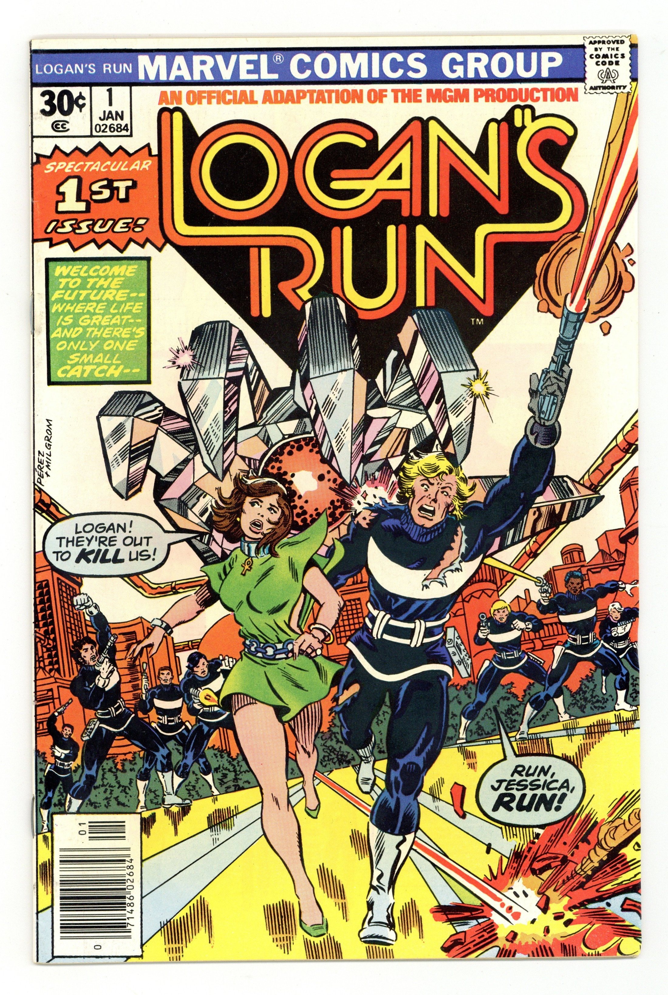 Cover by George Perez and Al Milgrom. "Logan's Run, Part 1". Part 1 of 5. Story by Gerry Conway (from the screenplay by David Zelag Goodman which was based on the novel by George Clayton Johnson and William F. Nolan). Pencils by George Perez. Inks by Klaus Janson. Welcome to the 23rd century, where life is perfect. There's just one catch. At birth everyone is implanted with a life jewel in their palm. When they reach the age of thirty, the jewel informs them they must report for termination. Not everyone accepts this however. Some choose to run. That's where Logan comes in. Logan is a Sandman, charged with terminating those who do not submit willingly. Everything changes when Logan meets Jessica and learns the secret of the Ankh she wears. This leads him to be assigned to find Sanctuary, the destination of all runners. To accomplish this task, he must become a runner himself. 32 pages. Full color. Cover price $0.30.