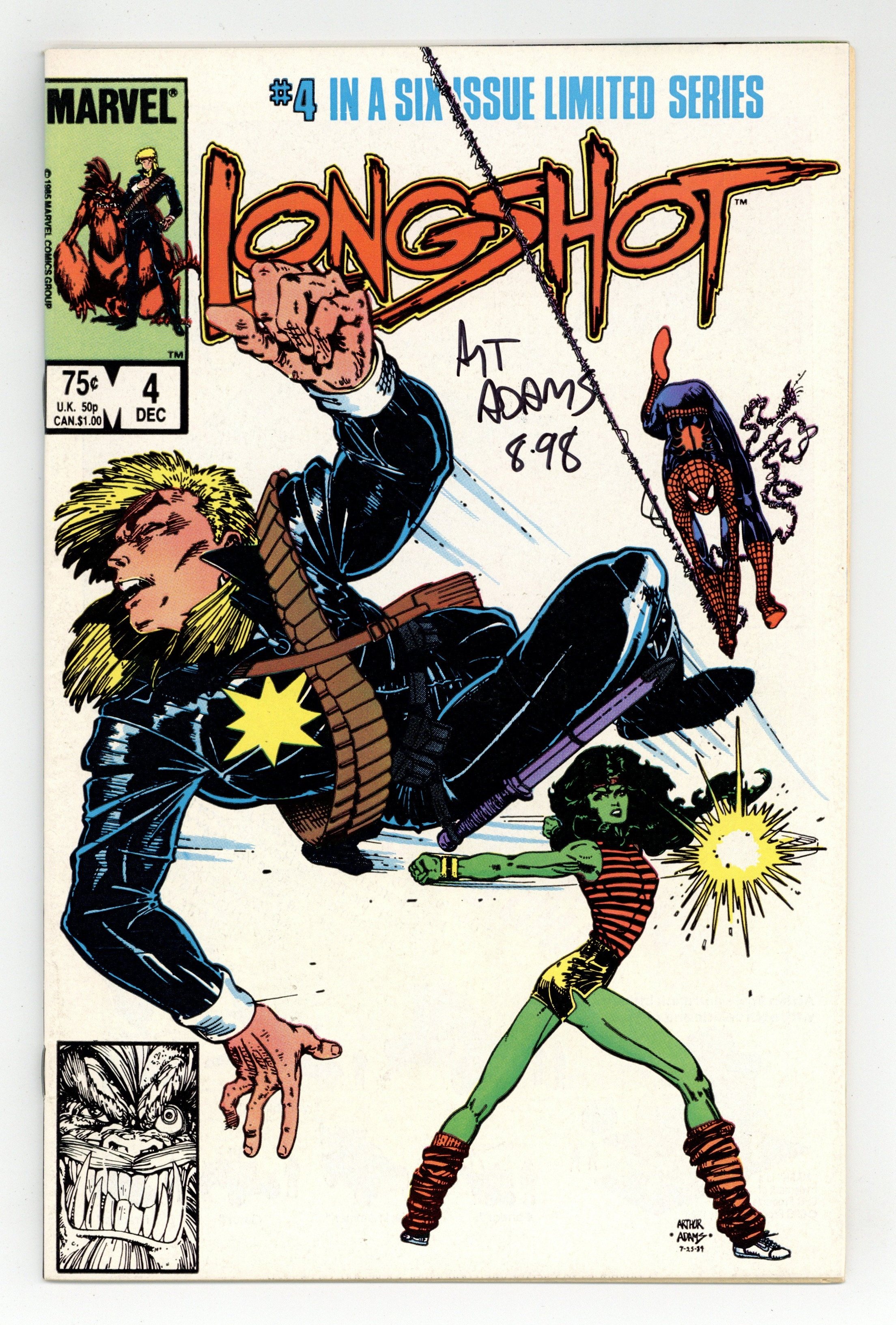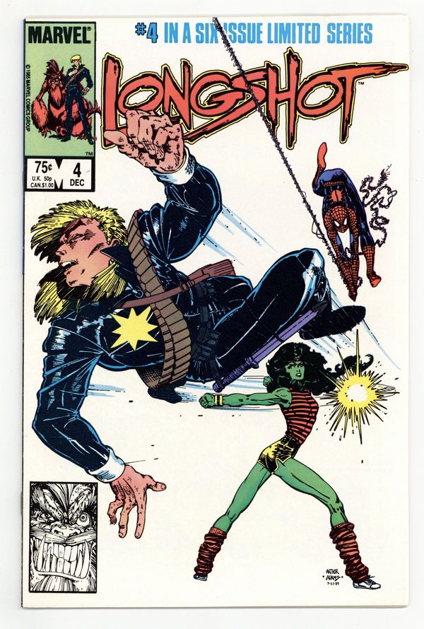 Direct Edition. Written by Ann Nocenti. Art by Arthur Adams, Whilce Portacio, and Scott Williams. Cover by Arthur Adams. Can't Give It All Away!; Thanks to his accidentally blacking out all of New York City and stealing diamonds from Con Ed, Longshot's picture is plastered all over the news as public enemy number one; He befriends Butch, Darla and their gang of friends and gives them some of the diamonds to spend; Running across, first She-Hulk and then Spider-Man, Longshot is attacked by both heroes and can't figure out why they are beating on him; Longshot's luck powers allow him to escape and he once again reunites with the gang of kids who now have a gun and are going on a monster hunt; Longshot touches the gun and it sparks more memories of his former life. 36 pgs., full color. $0.75. Cover price $0.75.