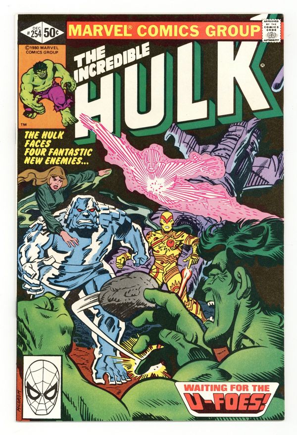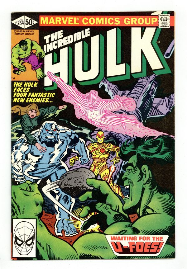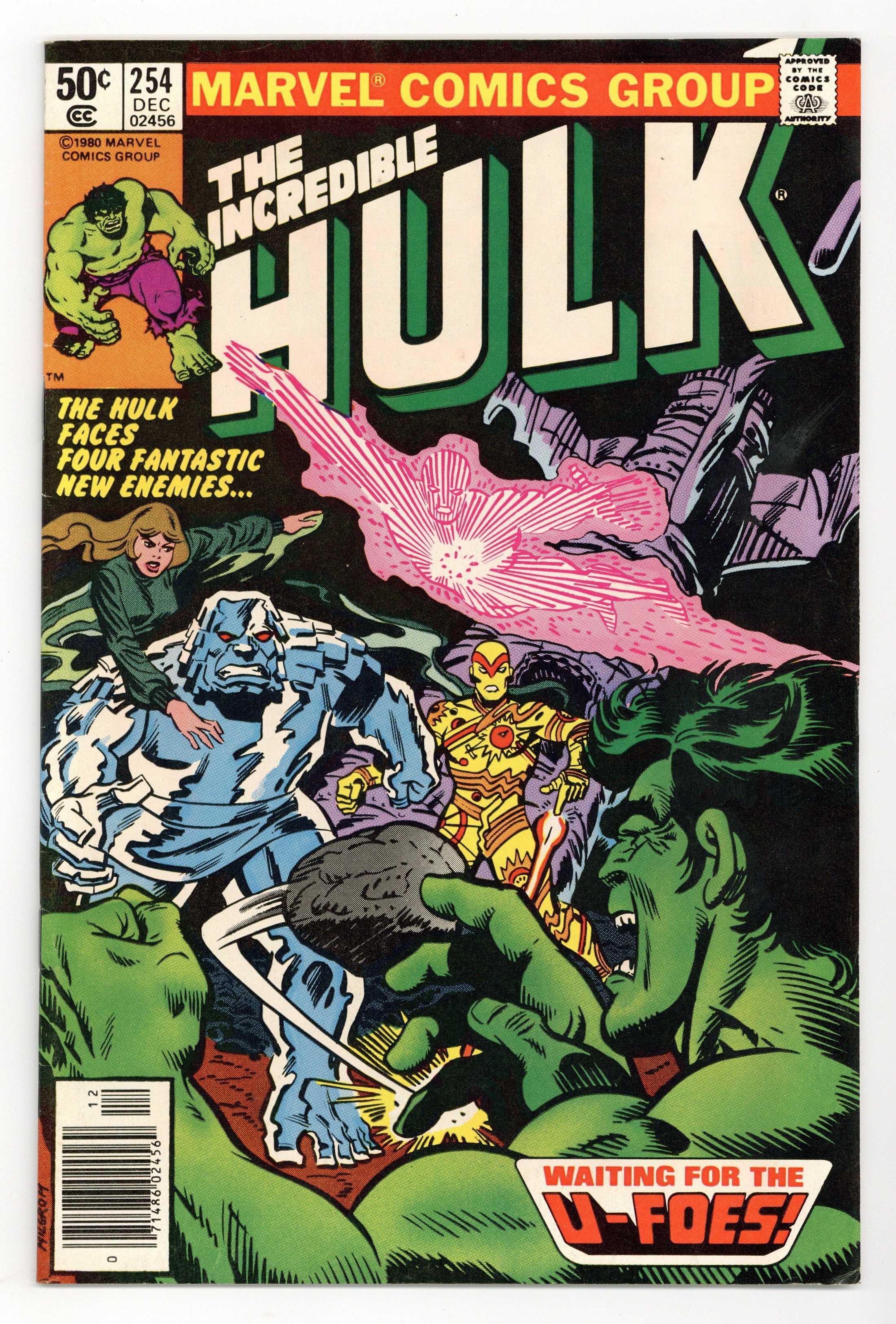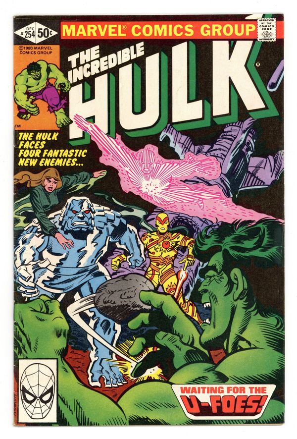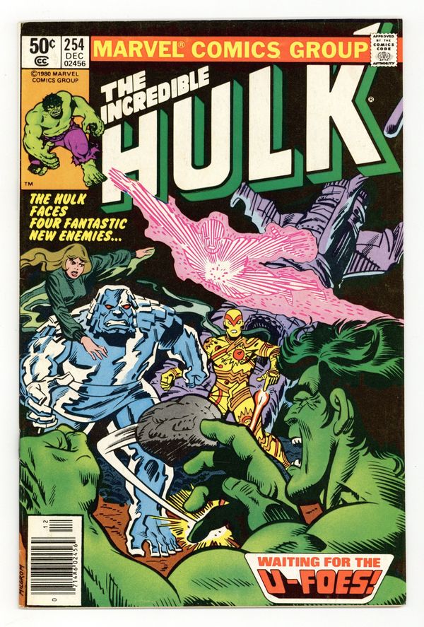 Tags: Hulk World Tour (part 1), Marvel Legacy Numbering: Hulk (part 254)$9.001st appearance of the U-Foes. "Waiting for the U-Foes!" Story by Bill Mantlo. Art by Sal Buscema. Meet the evil Fantastic Four. Wanting to duplicate the accident that transformed the FF into super-powerful beings, millionaire Simon Utecht along with his cohorts expose themselves to the same cosmic rays. His genetic structure altered, Utecht becomes Vector, able to repel objects with violent force. His colleagues become the gaseous villainous, Vapor, the radioactive threat, X-Ray, and the monstrous Ironclad. The U-Foes will go on to be some of the Hulks most enduring foes. Witness their first epic battle. 36 pages. Cover price $0.50.