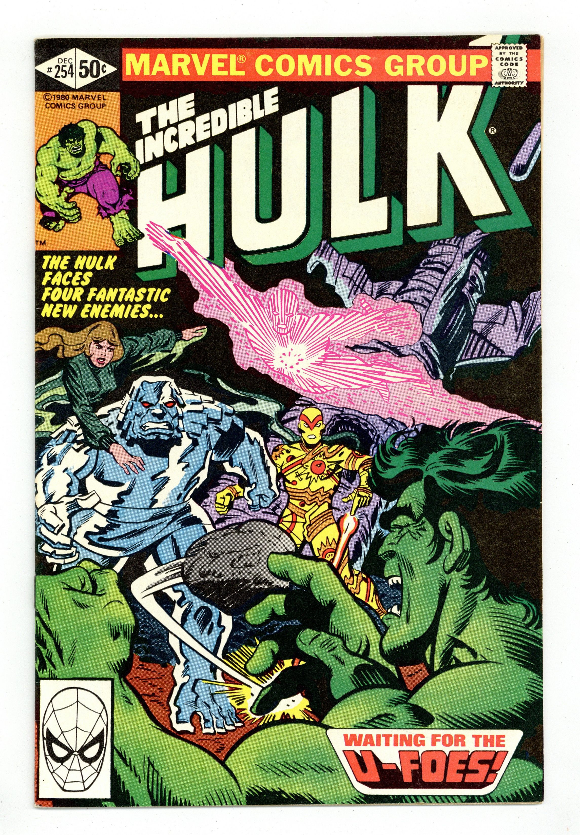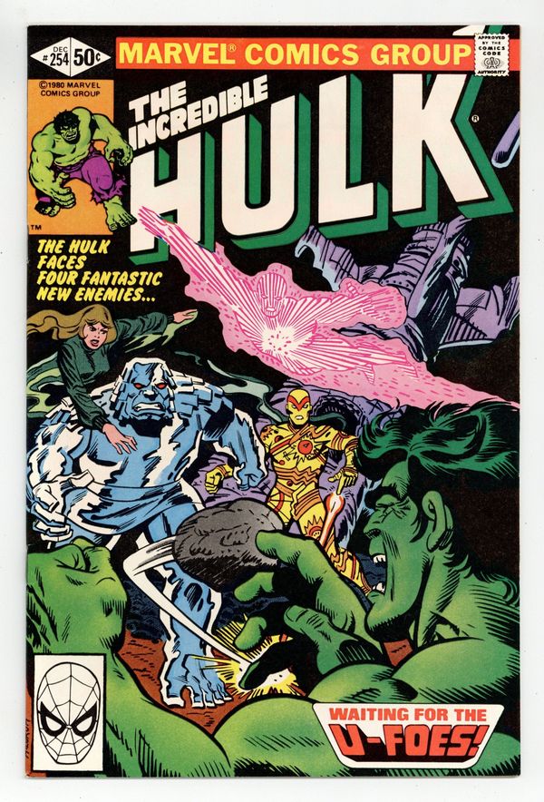 1st appearance of the U-Foes. "Waiting for the U-Foes!" Story by Bill Mantlo. Art by Sal Buscema. Meet the evil Fantastic Four. Wanting to duplicate the accident that transformed the FF into super-powerful beings, millionaire Simon Utecht along with his cohorts expose themselves to the same cosmic rays. His genetic structure altered, Utecht becomes Vector, able to repel objects with violent force. His colleagues become the gaseous villainous, Vapor, the radioactive threat, X-Ray, and the monstrous Ironclad. The U-Foes will go on to be some of the Hulks most enduring foes. Witness their first epic battle. 36 pages. Cover price $0.50.