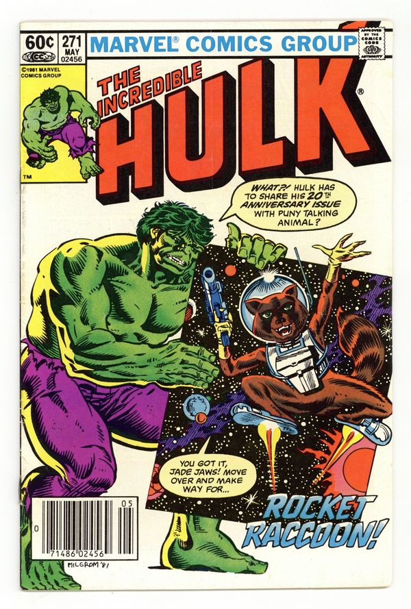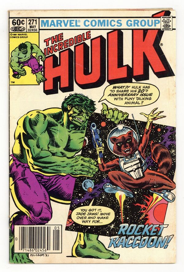 Tags: Marvel Legacy Numbering: Hulk (part 271), Hulk$90.00Newsstand Edition. 2nd appearance of Rocket Raccoon (see Marvel Preview #7 for 1st appearance). Story by Bill Mantlo. Art by Sal Buscema. The Hulk celebrates his 20th Anniversary with one of the most offbeat stories of all. Following the events of last issue, Hulk hurtles through the void only to run into the marvelous Rocket Raccoon and his band of colorful friends. Can the Hulk aid Rocket and his crew against the machiavellian Judson Jakes and his sinister scientist, the tortoise Uncle Pyko? 36 pages. Cover price $0.60.