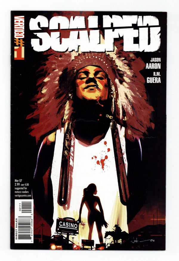 Written by Jason Aaron. Art by R.M. Guéra. Cover by Jock. Introducing SCALPED, an all-new monthly series by up-and-coming writer Jason Aaron (THE OTHER SIDE) featuring the gritty art of R.M. Guéra (Heavy Metal). Fifteen years ago, Dashiell 'Dash' Bad Horse ran away from a life of abject poverty and utter hopelessness on the Prairie Rose Indian Reservation in hopes of finding something better. Now, he's come back home to find nothing much has changed on 'The Rez' - short of a glimmering new casino, and a once-proud people overcome by drugs and organized crime. So is he back to set things right or just get a piece of the action? Also at the center of the storm is Tribal Leader Lincoln Red Crow, a former 'Red Power' activist turned burgeoning crime boss who figures that after 100 years of the Lakota being robbed and murdered by the white man, it's now time to return the favor. Now Dash - armed with nothing but a set of nunchucks, a hellbent-for-leather attitude and (at least) one dark secret - must survive a world of gambling, gunfights, G-men, Dawg Soldierz, massacres, meth labs, trashy sex, fry bread, Indian pride, Thunder Beings, the rugged beauty of the Badlands...and even a brutal scalping or two. For a dose of Sopranos-style organized crime drama mixed with current Native American culture, look no further than SCALPED! On sale January 3 ? 32 pg, FC, $2.99 US ? MATURE READERS Edited by Will Dennis Cover price $2.99.