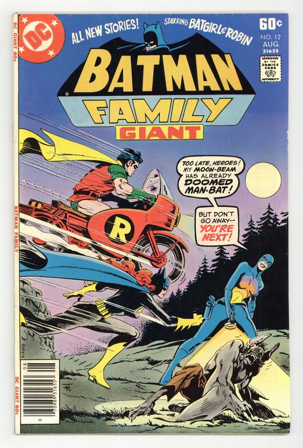 Tags: Batman$12.50Giant-size issue. Cover by Jim Aparo. All-new content. First 60-cent cover price. Batgirl stars in "I Am Batgirl's Brother!" Script by Bob Rozakis, pencils by Jose Delbo, inks by Vince Colletta. Man-Bat stars in "Dread Night of the Jaguar." Script by Rozakis, pencils by Marshall, inks by Terry Austin. Robin stars in "Rally 'Round Robin!" Script by Rozakis, pencils by Irv Novick, inks by Colletta. Cover price $0.60.