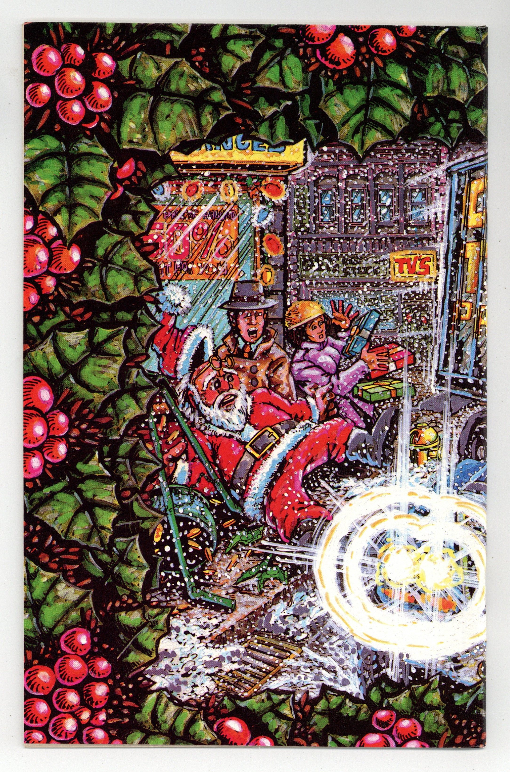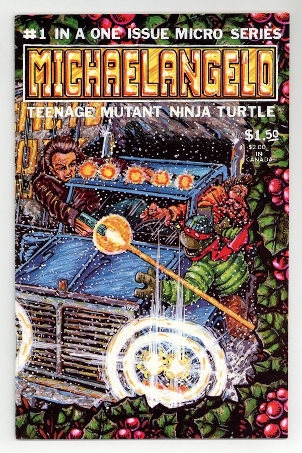 Michaelangelo of the Teenage Mutant Ninja Turtles has a solo Christmas adventure, as he battles hoodlums who have hijacked a truck full of toys intended for an orphanage. Part of a series of one-shots featuring the Turtles in solo stories. Story and art by Kevin Eastman and Peter Laird. Backup story featuring Gizmo; story and art by Michael Dooley. Black and white; 44 pages. Wraparound cover by Eastman. Cover price $1.50. Cover price $1.50.