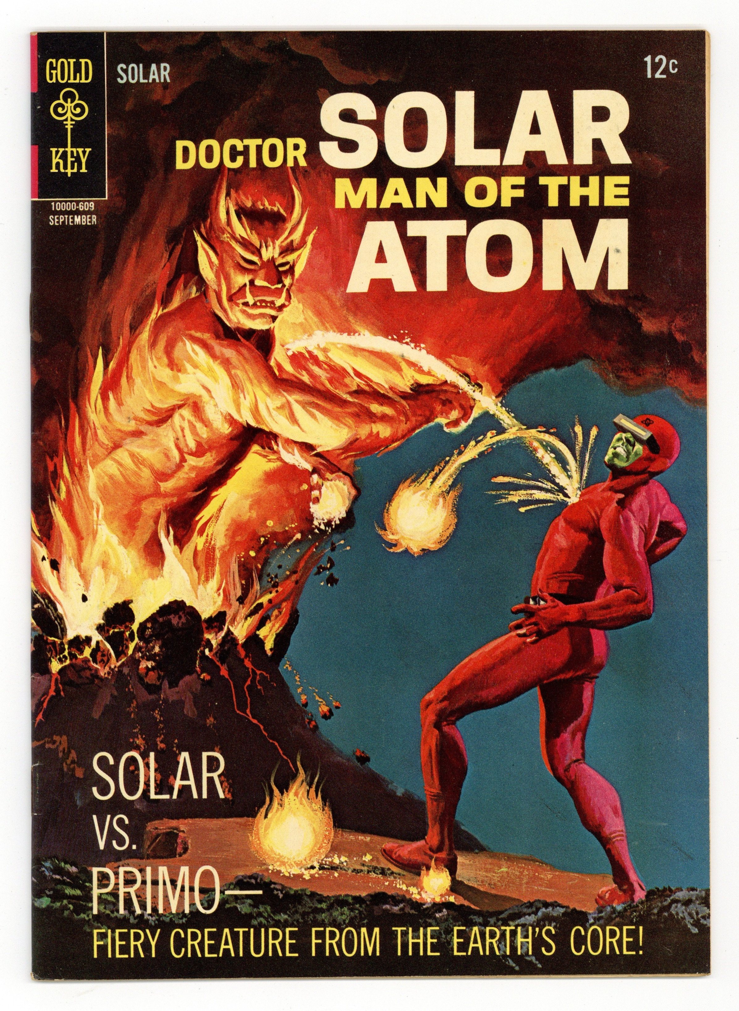 Dr. Solar in "The Fatal Foe Part 1 - The Monster Attacks!" and "Part 2 - Duel to Disintegration!" (First appearance of Orun, Nuro's "mechanical namesake") and Professor Harbinger in "Cold Facts!" One page "Doctor Solar Forms of Energy" and "Secrets of Atom Valley" features. Statement of ownership--average print run 407,454; average paid circulation 226,720. Painted front cover. Number on cover 10000-609 September. Cover price $0.12.