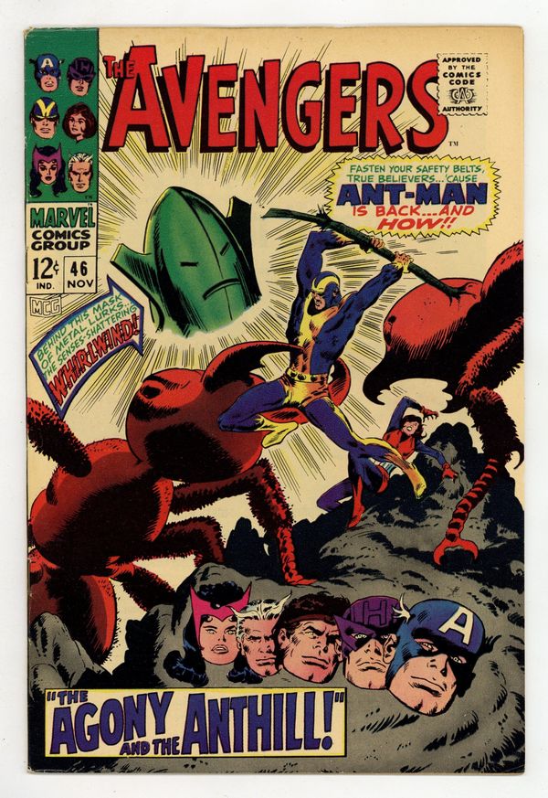 Starts Dec 15 "The Agony and the Anthill!" Script by Roy Thomas. Pencils by John Buscema. Inks by Vince Colletta. Cover by John Buscema. After several busy days, the Avengers briefly convene at their Fifth Avenue mansion before going their separate ways for rest and relaxation. However Hank Pym andJanet van Dyne decide to remain at the mansion to work on a new experiment involving red ants. But the dramatic appearance of the Whirlwind (formerly known as the Human Top) interrupts their work! Goliath and the Wasp havedefeated him in the past. However the Whirlwind scouted Avengers Mansion earlier in the day (as Jan's chauffer) -- and he blasts them with a reducing ray! Then the Whirlwind throws the pair into Hank's ant farm without their cybernetic equipment. So Hank and Jan cannot talk to the ants! And the ants are very hungry! The situation looks grim...and becomes even grimmer when the Whirlwind plants a bomb inside the mansion to kill the remaining avengers. How can Earth's Mightiest Heroes turn their plight around...andavoid reaping the whirlwind? Cameo appearance by the Black Widow. Avengers Lineup: Captain America, Goliath, Hawkeye, Hercules, Quicksilver, Scarlet Witch, and the Wasp. (Note: This story was reprinted in Marvel Triple Action #38.) 36 pages. Cover price $0.12.