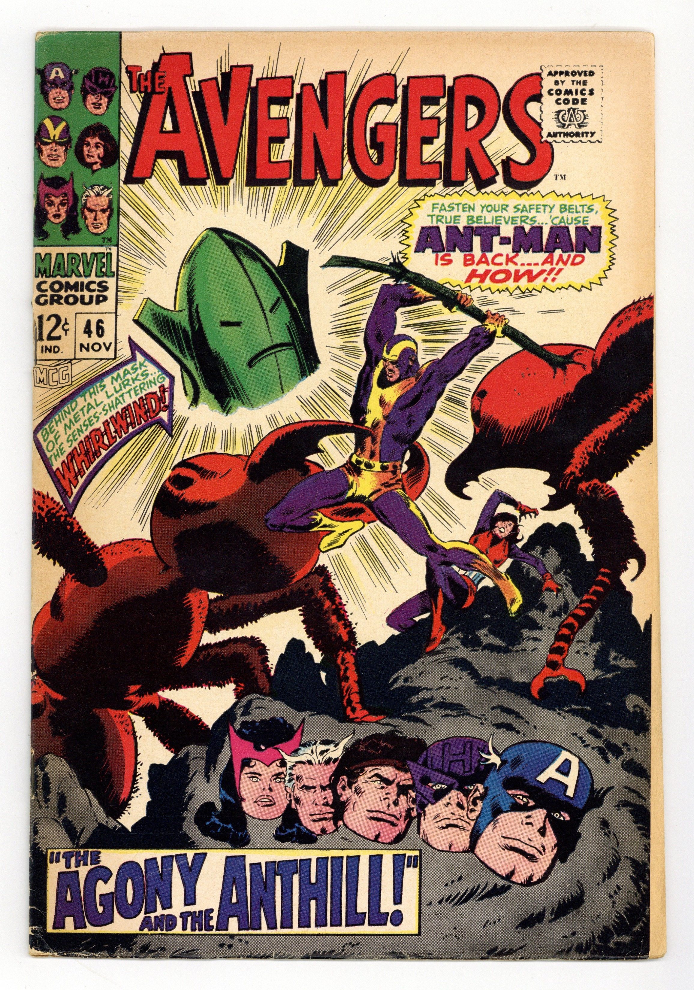 "The Agony and the Anthill!" Script by Roy Thomas. Pencils by John Buscema. Inks by Vince Colletta. Cover by John Buscema. After several busy days, the Avengers briefly convene at their Fifth Avenue mansion before going their separate ways for rest and relaxation. However Hank Pym andJanet van Dyne decide to remain at the mansion to work on a new experiment involving red ants. But the dramatic appearance of the Whirlwind (formerly known as the Human Top) interrupts their work! Goliath and the Wasp havedefeated him in the past. However the Whirlwind scouted Avengers Mansion earlier in the day (as Jan's chauffer) -- and he blasts them with a reducing ray! Then the Whirlwind throws the pair into Hank's ant farm without their cybernetic equipment. So Hank and Jan cannot talk to the ants! And the ants are very hungry! The situation looks grim...and becomes even grimmer when the Whirlwind plants a bomb inside the mansion to kill the remaining avengers. How can Earth's Mightiest Heroes turn their plight around...andavoid reaping the whirlwind? Cameo appearance by the Black Widow. Avengers Lineup: Captain America, Goliath, Hawkeye, Hercules, Quicksilver, Scarlet Witch, and the Wasp. (Note: This story was reprinted in Marvel Triple Action #38.) 36 pages. Cover price $0.12.