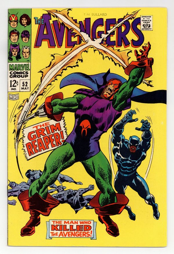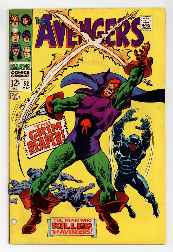 First appearance of the Grim Reaper in "Death Calls for the Arch-Heroes!" Script by Roy Thomas. Pencils by John Buscema. Inks by Vince Colletta. Cover by John Buscema. The Black Panther arrives at Avengers Mansion ready to join Earth's Mightiest Heroes! However when T'Challa reaches the main meeting room, he finds his three would-be teammates lying on the floor unconscious! The panther begins to render first aid, but Jasper Sitwell suddenly appears and arrests him for murder! While being transported to and questioned at the local police station, T'Challa puts the evening's strange pieces together! And the newest avenger rushes back to the mansion to face the true perpetrator! Wow, the Black Panther vs. the Grim Reaper! What a debut for the superhero and the super-villain! Cameo appearances by the Black Widow, Tony Stark, Captain America, and Thor. Flashback cameo by Wonder Man to recap the events of Avengers #9. Avengers Lineup: Black Panther, Goliath, Hawkeye, and the Wasp. (Notes: The Grim Reaper (aka Eric Williams) returns in Avengers #78 to continue his quest for revenge. The letters page includes a letter from comics writer Mike Uslan. This issue was reprinted in Marvel Triple Action #44.) 36 pages. Cover price $0.12.
