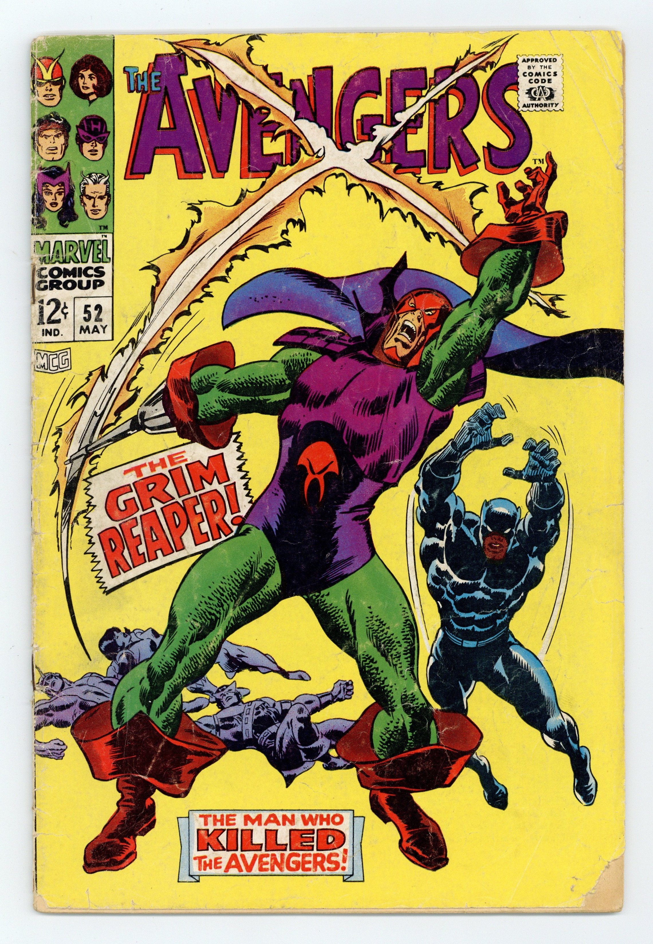 Starts May 25 First appearance of the Grim Reaper in "Death Calls for the Arch-Heroes!" Script by Roy Thomas. Pencils by John Buscema. Inks by Vince Colletta. Cover by John Buscema. The Black Panther arrives at Avengers Mansion ready to join Earth's Mightiest Heroes! However when T'Challa reaches the main meeting room, he finds his three would-be teammates lying on the floor unconscious! The panther begins to render first aid, but Jasper Sitwell suddenly appears and arrests him for murder! While being transported to and questioned at the local police station, T'Challa puts the evening's strange pieces together! And the newest avenger rushes back to the mansion to face the true perpetrator! Wow, the Black Panther vs. the Grim Reaper! What a debut for the superhero and the super-villain! Cameo appearances by the Black Widow, Tony Stark, Captain America, and Thor. Flashback cameo by Wonder Man to recap the events of Avengers #9. Avengers Lineup: Black Panther, Goliath, Hawkeye, and the Wasp. (Notes: The Grim Reaper (aka Eric Williams) returns in Avengers #78 to continue his quest for revenge. The letters page includes a letter from comics writer Mike Uslan. This issue was reprinted in Marvel Triple Action #44.) 36 pages. Cover price $0.12.