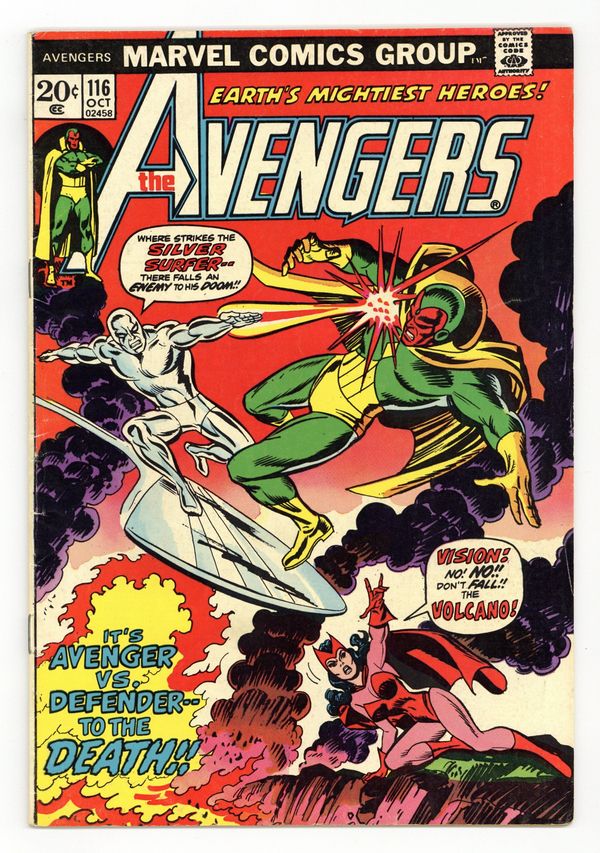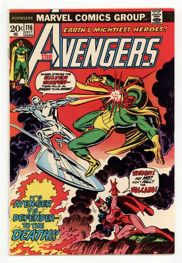 "Betrayal!" Avengers-Defenders crossover. Part 3 of 8. Guest-starring the Defenders. Script by Steve Englehart. Pencils by Bob Brown. Inks by Mike Esposito. Cover by John Romita and Mike Esposito. Story continues from Defenders 8. Earth's Mightiest Heroes visit Dr. Strange's townhouse in Greenwich Village and request permission to enter, but Wong slams the door in their faces! After an angry Thor breaks down the door, the Avengers storm inside, but a mystic spell sweeps them back out onto the street! Meanwhile gathered around the Orb of Agamotto, the Defenders put together a plan to find the six pieces of the Evil Eye. However, in the dark realm, Loki has grown suspicious of his dreadful ally! And contacts the Avengers to tell them about the Defenders' search for the ancient instrument from Avalon! So the die is cast! And the blockbuster battles are about to begin! Flashback cameos by Prester John, Wyatt Wingfoot, and the Human Torch to recap the history of the Evil Eye. Next Chapter: "The Silver Surfer vs. the Vision and the Scarlet Witch" The Avengers-Defenders Clash kicks into high gear as members of both teams span the globe to searching for the Evil Eye! And the first showdown features two of the most popular Marvel super-heroes of the 1970's! The Silver Surfer arrives in French Polynesia and plunges into the island's indigenous volcano to look for the Evil Eye. But the cosmic sky-rider's probing triggers a volcanic eruption! The fiery blast knocks a passing quinjet out of the sky and nearly kills the Scarlet Witch! Needless to say, this act enrages the synthezoid avenger! And in the heart of the raging volcano, the Vision and the Silver Surfer fight for the Evil Eye! Story continues in Defenders 9. (Notes: The Evil Eye previously appeared in Fantastic Four 54. This issue includes a full-page survey for readers to complete and mail back to the Marvel bullpen. A reprint edition exists for this issue.) 36 pgs. Cover price $0.20.
