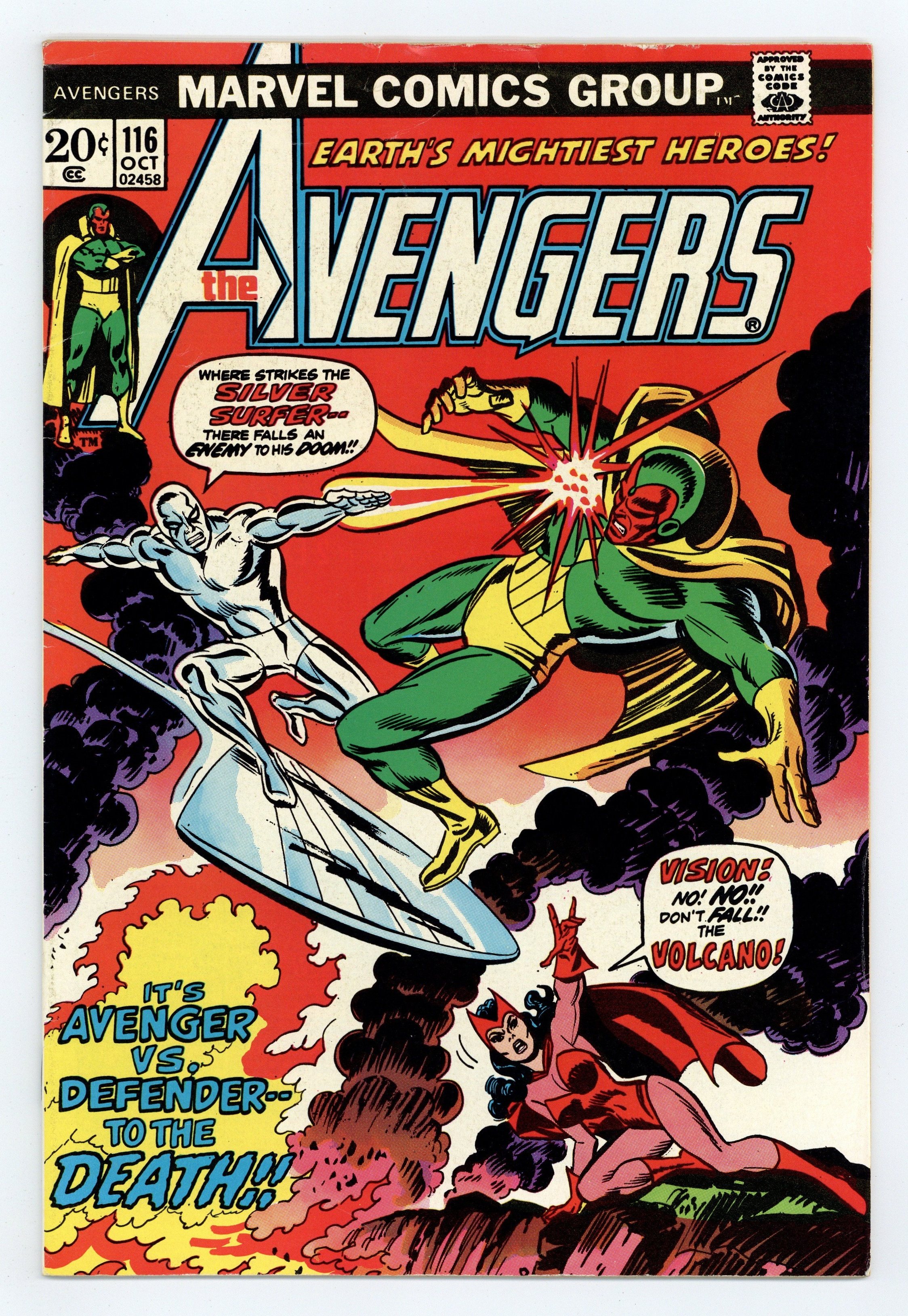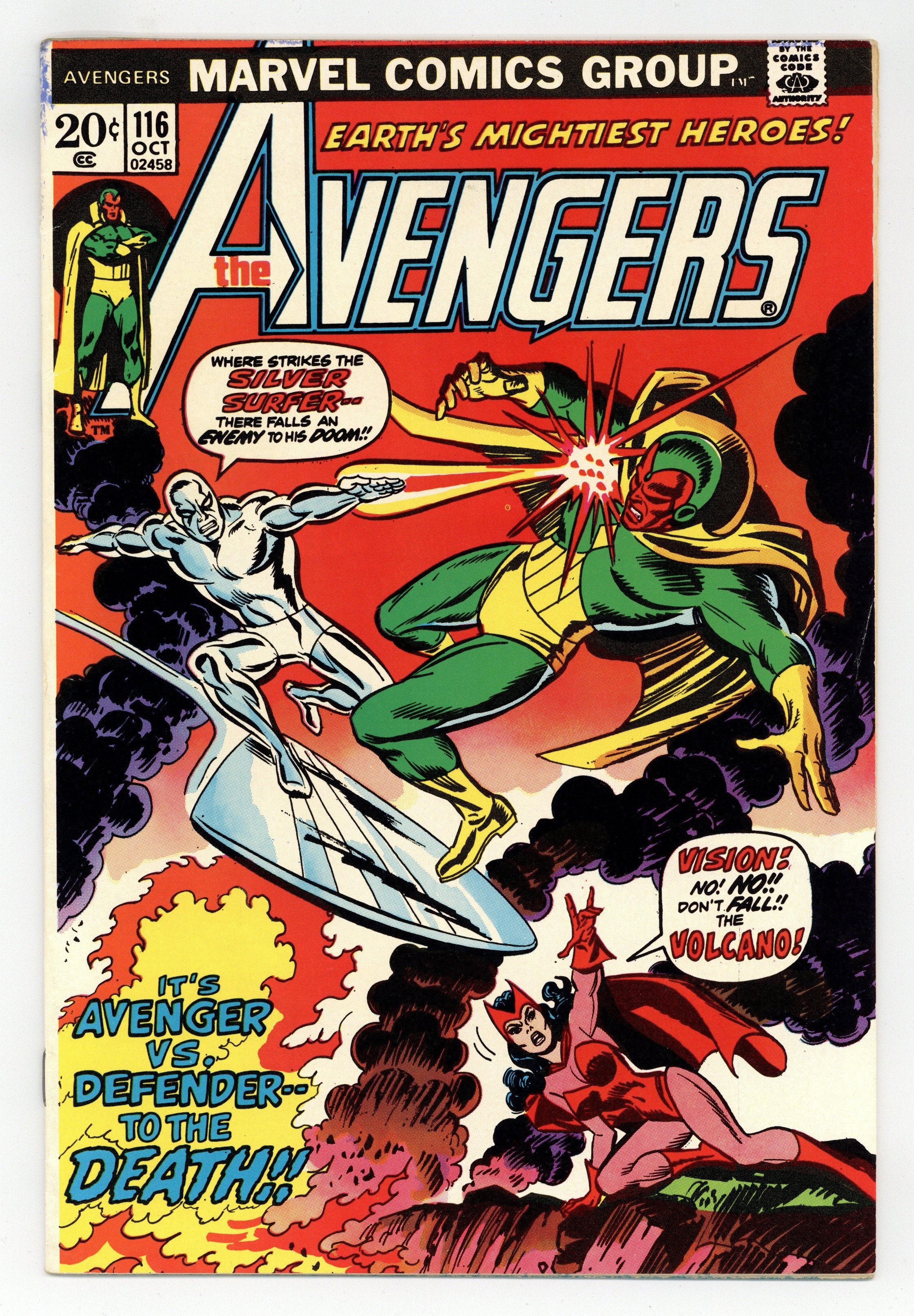Tags: Avengers/Defenders War (part 3), Marvel Legacy Numbering: Avengers (part 116)$18.50"Betrayal!" Avengers-Defenders crossover. Part 3 of 8. Guest-starring the Defenders. Script by Steve Englehart. Pencils by Bob Brown. Inks by Mike Esposito. Cover by John Romita and Mike Esposito. Story continues from Defenders 8. Earth's Mightiest Heroes visit Dr. Strange's townhouse in Greenwich Village and request permission to enter, but Wong slams the door in their faces! After an angry Thor breaks down the door, the Avengers storm inside, but a mystic spell sweeps them back out onto the street! Meanwhile gathered around the Orb of Agamotto, the Defenders put together a plan to find the six pieces of the Evil Eye. However, in the dark realm, Loki has grown suspicious of his dreadful ally! And contacts the Avengers to tell them about the Defenders' search for the ancient instrument from Avalon! So the die is cast! And the blockbuster battles are about to begin! Flashback cameos by Prester John, Wyatt Wingfoot, and the Human Torch to recap the history of the Evil Eye. Next Chapter: "The Silver Surfer vs. the Vision and the Scarlet Witch" The Avengers-Defenders Clash kicks into high gear as members of both teams span the globe to searching for the Evil Eye! And the first showdown features two of the most popular Marvel super-heroes of the 1970's! The Silver Surfer arrives in French Polynesia and plunges into the island's indigenous volcano to look for the Evil Eye. But the cosmic sky-rider's probing triggers a volcanic eruption! The fiery blast knocks a passing quinjet out of the sky and nearly kills the Scarlet Witch! Needless to say, this act enrages the synthezoid avenger! And in the heart of the raging volcano, the Vision and the Silver Surfer fight for the Evil Eye! Story continues in Defenders 9. (Notes: The Evil Eye previously appeared in Fantastic Four 54. This issue includes a full-page survey for readers to complete and mail back to the Marvel bullpen. A reprint edition exists for this issue.) 36 pgs. Cover price $0.20.