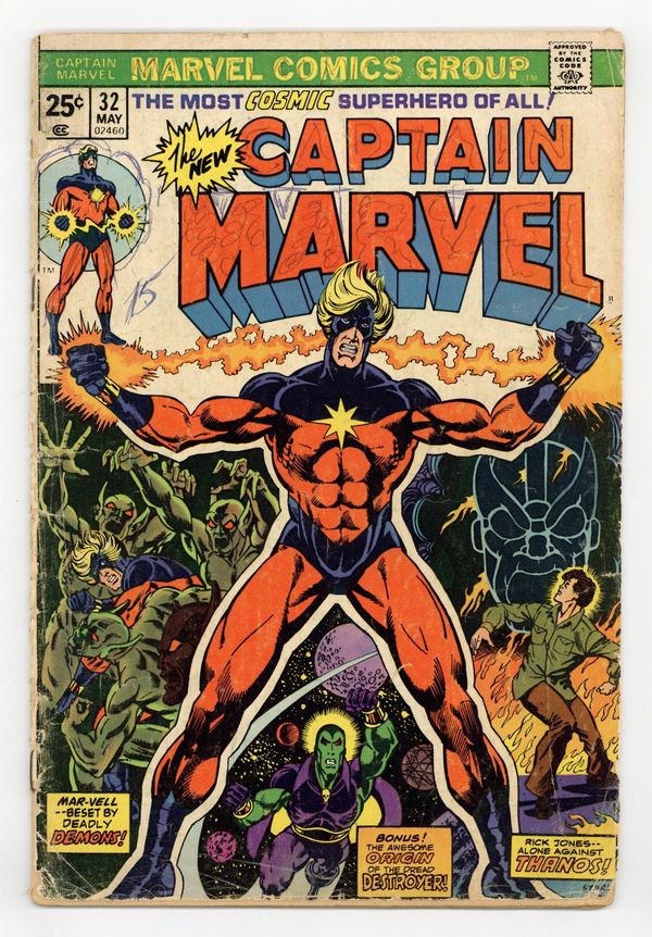 "Thanos the Insane God!" Guest-starring Iron Man. Origin of Drax the Destroyer. Script by Jim Starlin and Mike Friedrich (writing assist). Pencils by Jim Starlin. Inks by Dan Green. Cover by Jim Starlin and Klaus Janson. Incredibly the powerful Thanos has ascended to godhood! But the awesome battle rages on! While Captain Marvel and Iron Man fight Thanos' minions on Titan, the enraged Drax the Destroyer attacks Thanos in outer space! Thanos the man was already difficult to beat. What chance is there against Thanos the god? Meanwhile, the mad Titan's alien armada zooms towards Earth! But the Mighty Avengers are ready and waiting for their close encounter with Thanos' kind! Story continues in Avengers 125. Cameo appearances by the Avengers, Death, ISAAC, Lou-Ann Savannah, Rick Jones, Mentor, Moondragon, and Eros. First 25¢ issue. (Notes: The letters page includes a half-page map of Titan. The letters page also contains Marvel Value Stamp series A #19 Hogun, Balder, and Fandral.) 32 pages Cover price $0.25.