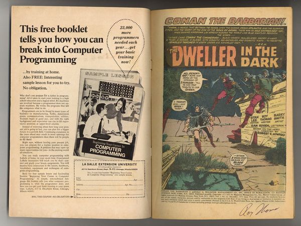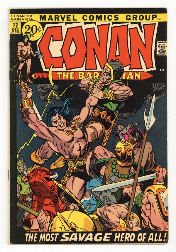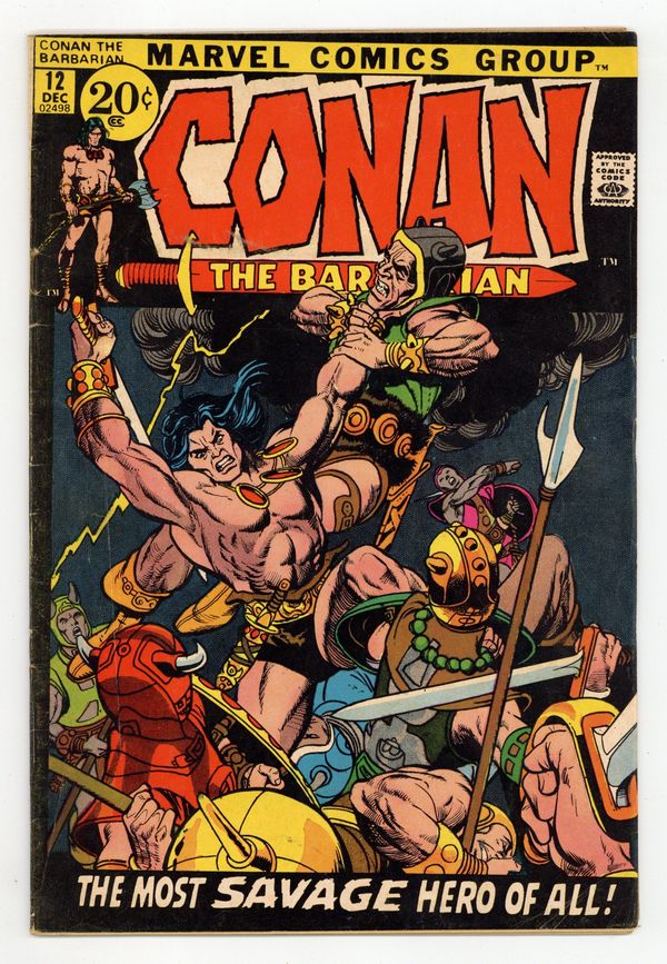 First 20-cent cover price. Cover pencils by Gil Kane, inks by Vince Colletta. First 20-cent cover price. The Dweller in the Dark, script by Roy Thomas, art by Barry Windsor-Smith; setting: Corinthinan city of Zahmahn; Conan becomes Fatima's lover; Fatima throws Conan & Yaila to monster in dungeon; Conan escapes, throws Fatima to monster and makes Yaila the new Queen. This story was originally intended for Savage Tales 2 before it was canceled (the first time). The art was altered so that it would pass the Comics Code and published here. See Savage Tales 4 for the original, unaltered version. (The muddy reprint in Conan Saga 5 is from the altered version.) Back-up story, The Blood of the Dragon, script by Thomas, pencils by Gil Kane, inks by Kane, Tom Palmer, and Berni Wrightson. 36 pgs. Cover price: $0.20. Cover price $0.20.