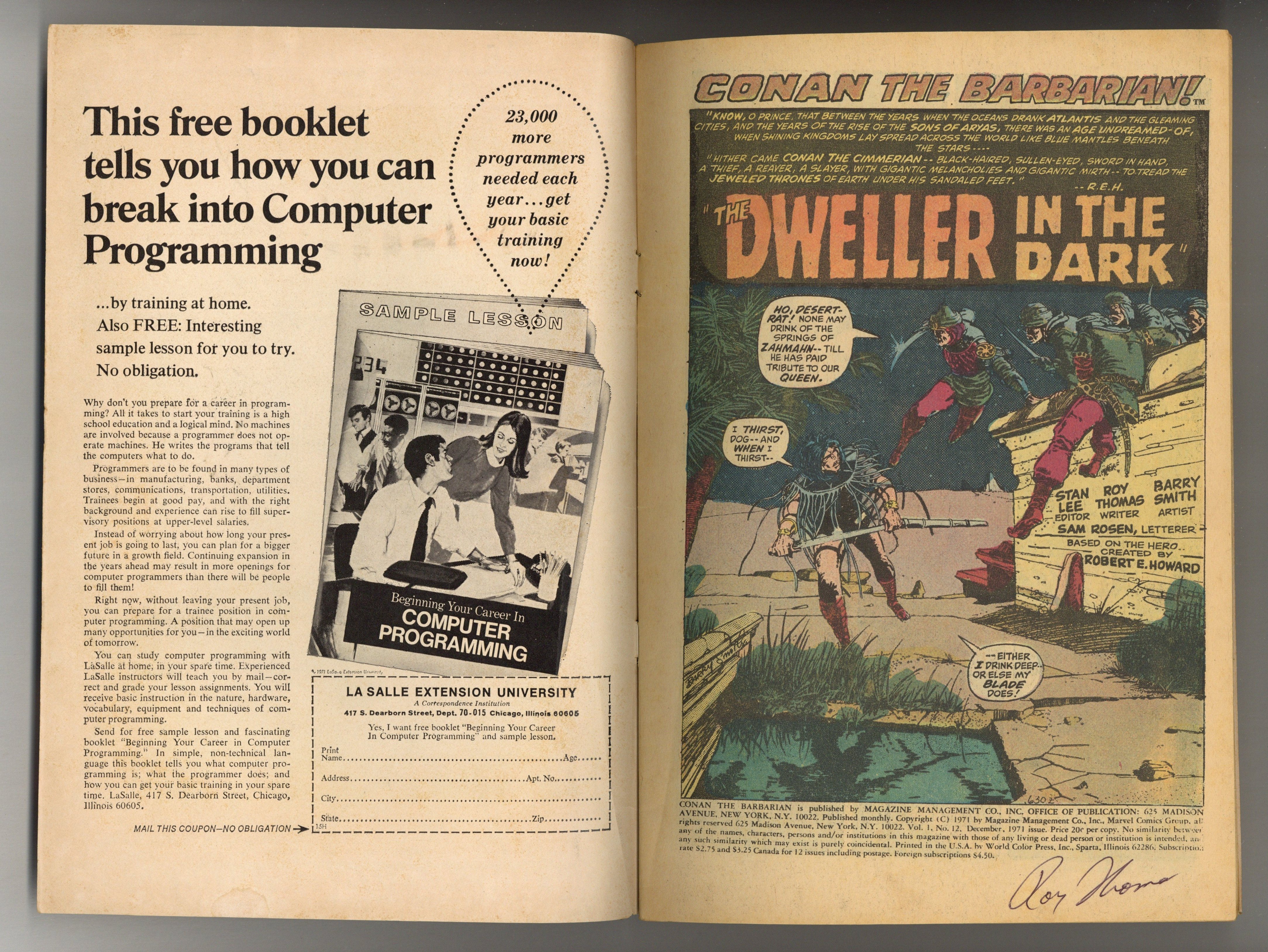 Tags: Marvel Legacy Numbering: Conan (part 12), Conan$25.00- Signed by writer Roy Thomas (splash), does not include certificate of authenticity. Water damage.