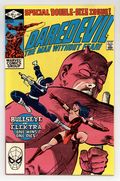 $29.50Direct Edition. Cover pencils by Frank Miller, inks by Klaus Janson. Last Hand, script by Frank Miller, pencils by Frank Miller (breakdowns) and Klaus Janson (finished art), inks by Klaus Janson; Bullseye breaks out of prison; Elektra hunts down Foggy and is about to kill him until she recognizes him as Matt's buddy from college; Bullseye fights Elektra and kills her with her own sai; DD goes after Bullseye and ends up dropping him from a great height, breaking every bone in his body; Kingpin appearance; story narrated by Bullseye; story dedicated to the memory of Wally Wood 1927-1981. Full page pin-up ad for Marvel Fanfare, art by Michael Golden. Statement of Ownership average # of copies in preceding 12 months: 276,812 Cover price $1.00.