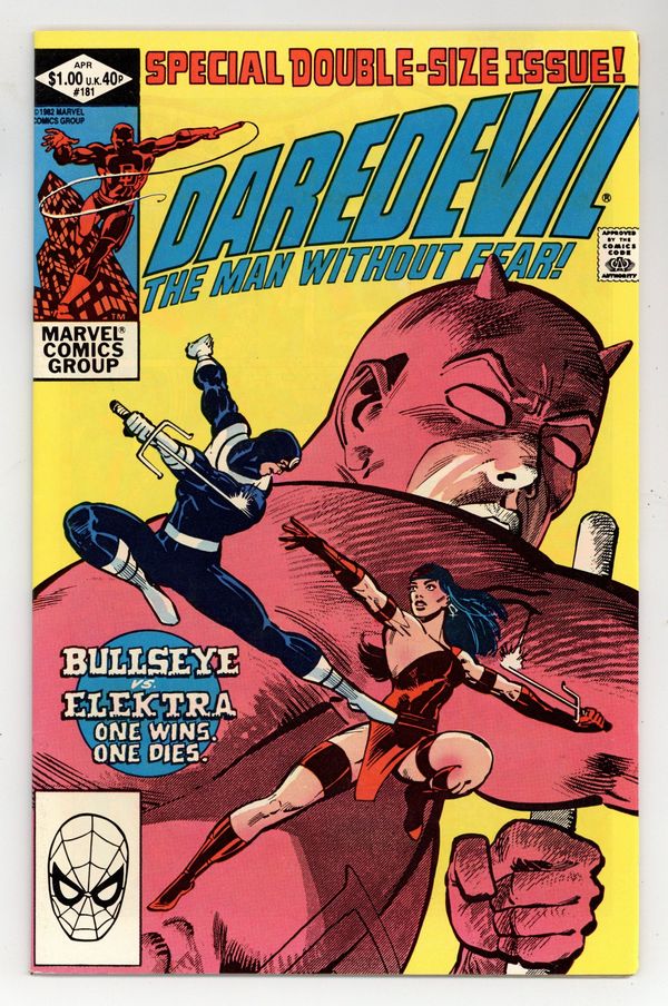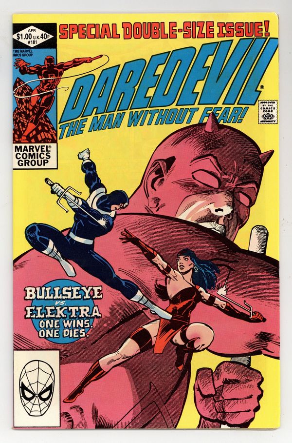 Direct Edition. Cover pencils by Frank Miller, inks by Klaus Janson. Last Hand, script by Frank Miller, pencils by Frank Miller (breakdowns) and Klaus Janson (finished art), inks by Klaus Janson; Bullseye breaks out of prison; Elektra hunts down Foggy and is about to kill him until she recognizes him as Matt's buddy from college; Bullseye fights Elektra and kills her with her own sai; DD goes after Bullseye and ends up dropping him from a great height, breaking every bone in his body; Kingpin appearance; story narrated by Bullseye; story dedicated to the memory of Wally Wood 1927-1981. Full page pin-up ad for Marvel Fanfare, art by Michael Golden. Statement of Ownership average # of copies in preceding 12 months: 276,812 Cover price $1.00.