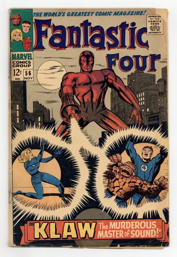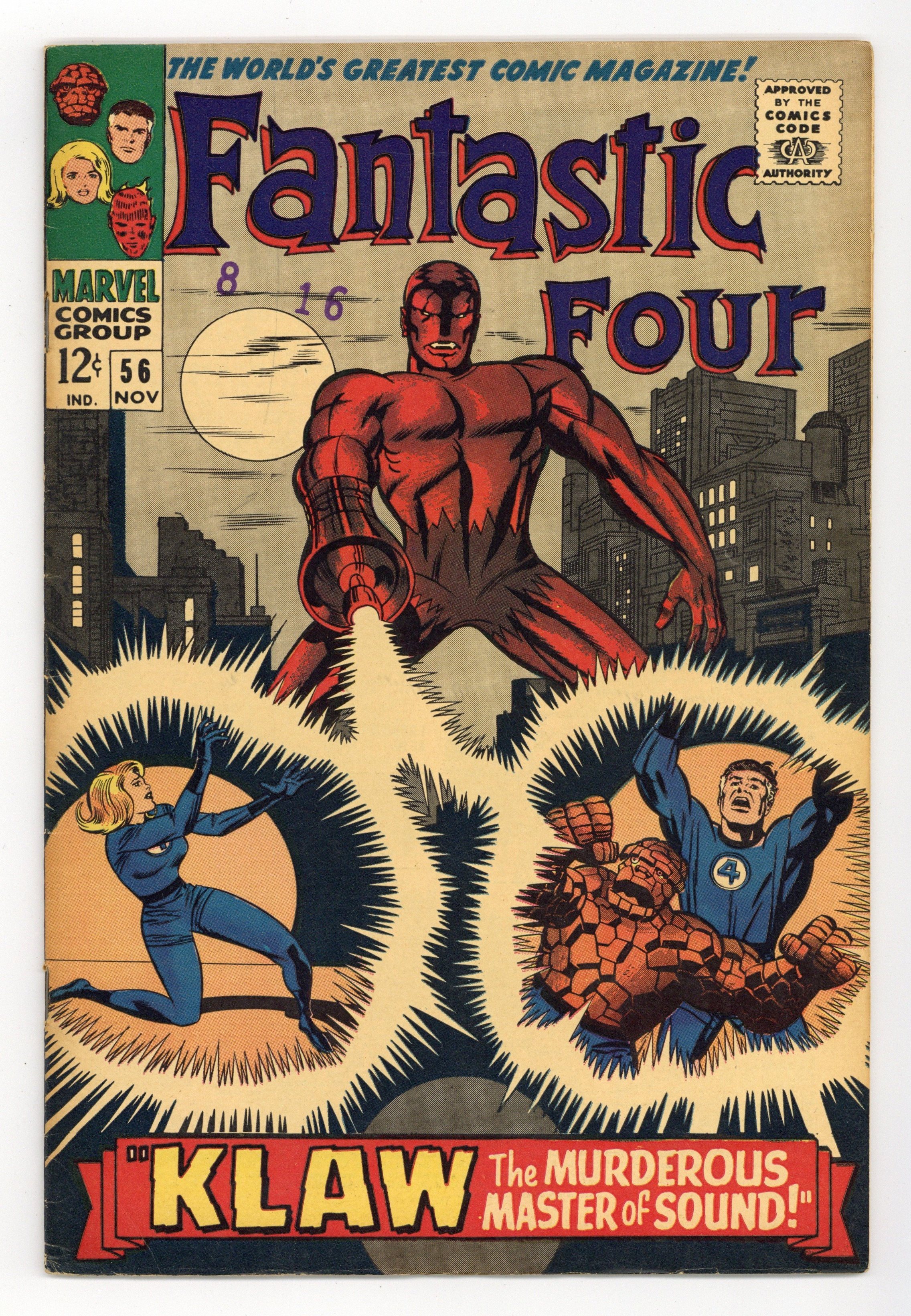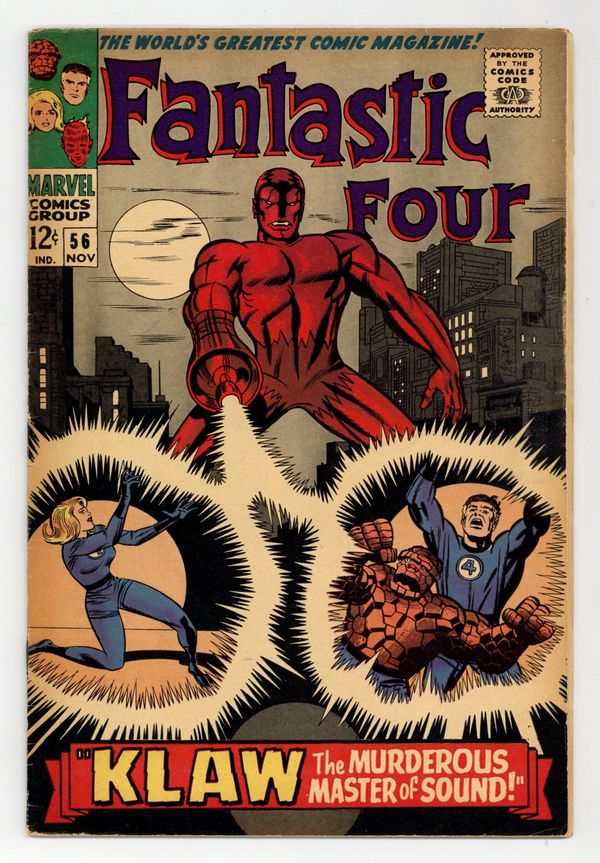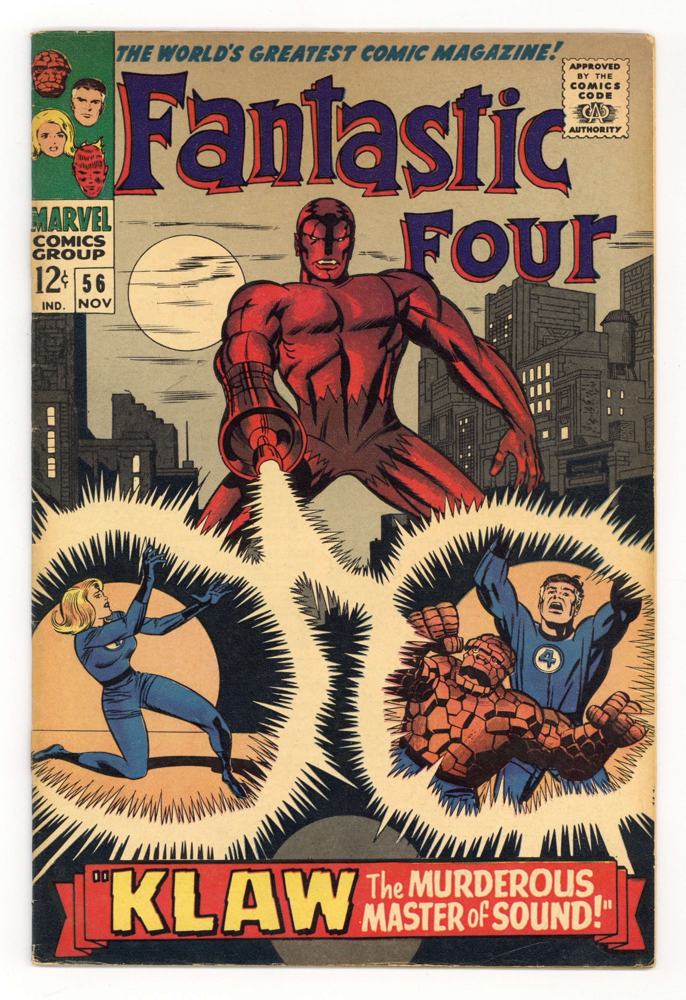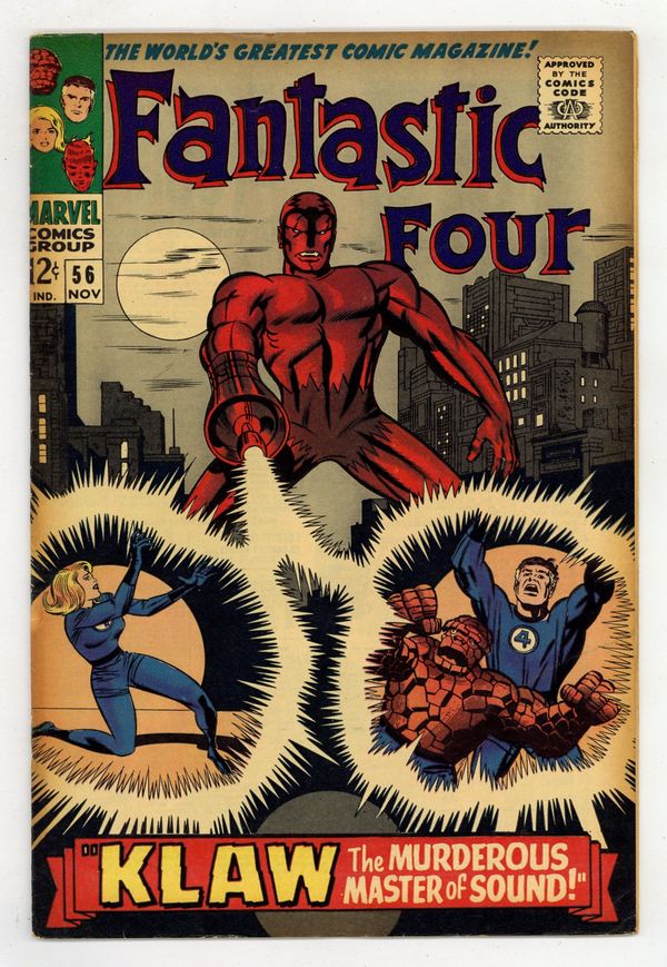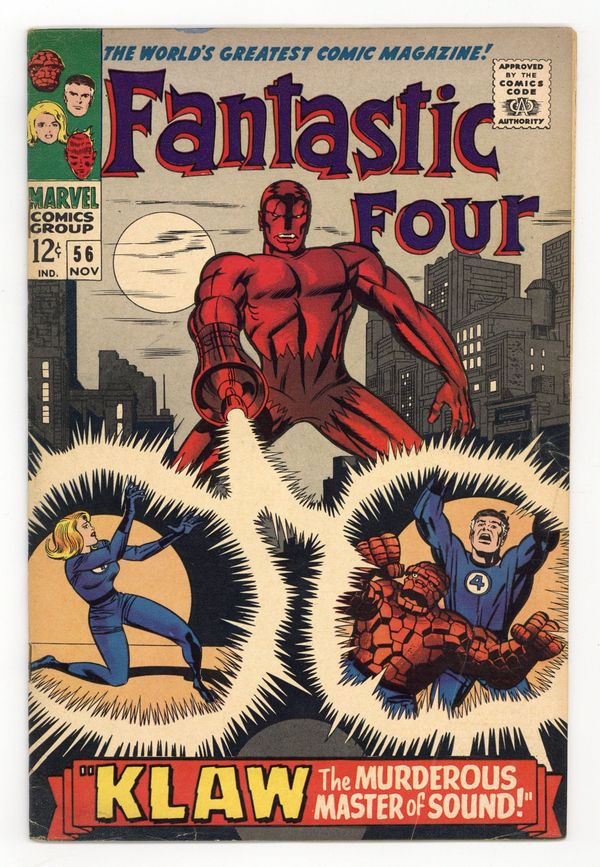 Tags: Fantastic Four$23.50Cover pencils by Jack Kirby, inks by Joe Sinnott. Klaw The Murderous Master of Sound!, script by Stan Lee, pencils by Jack Kirby, inks by Joe Sinnott; Klaw attacks the Baxter Building. The Silver Surfer, the Inhumans, Doctor Doom, and the Black Panther all have brief appearances. 36 pgs. $0.12. Cover price $0.12.