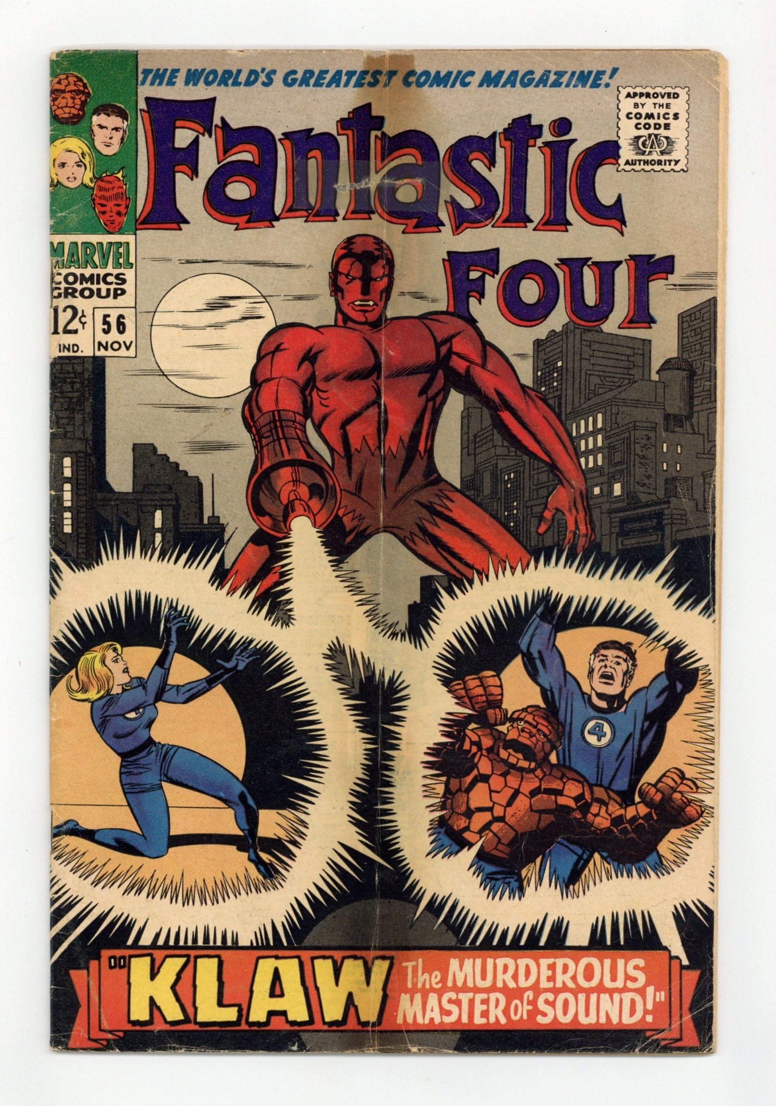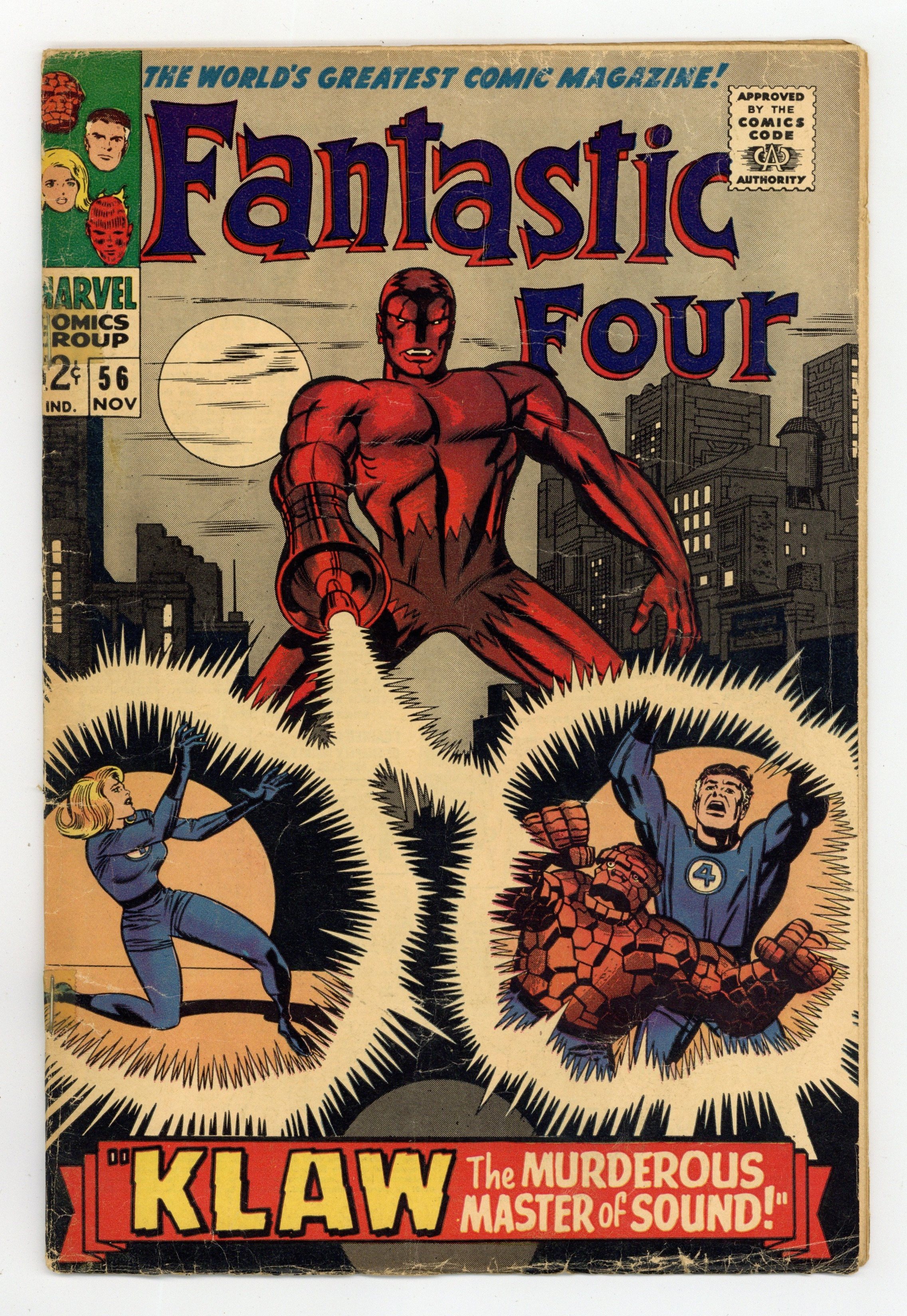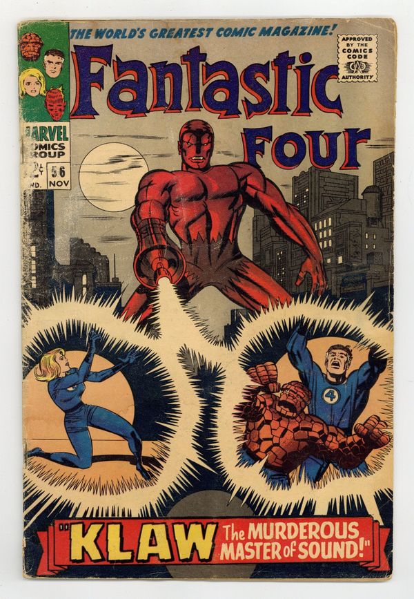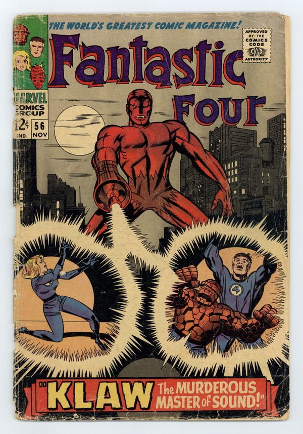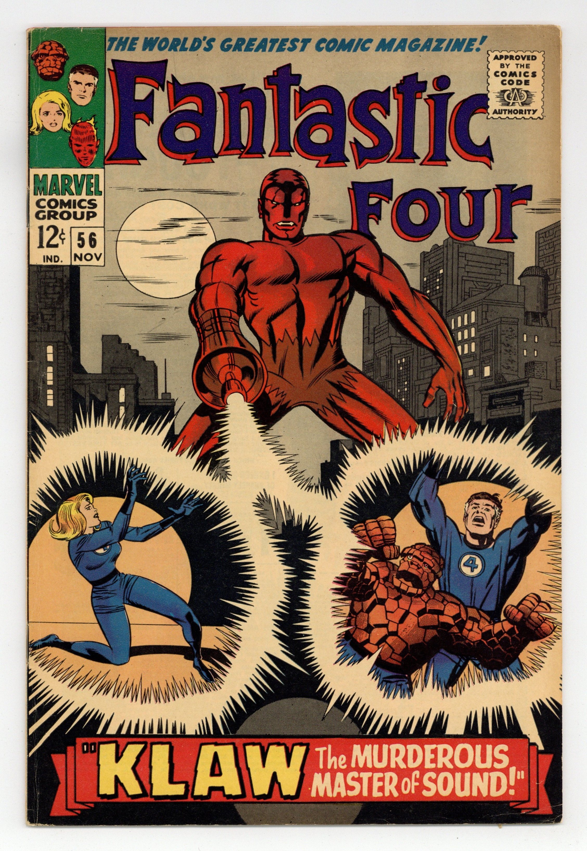 Tags: Fantastic Four$23.50Cover pencils by Jack Kirby, inks by Joe Sinnott. Klaw The Murderous Master of Sound!, script by Stan Lee, pencils by Jack Kirby, inks by Joe Sinnott; Klaw attacks the Baxter Building. The Silver Surfer, the Inhumans, Doctor Doom, and the Black Panther all have brief appearances. 36 pgs. $0.12. Cover price $0.12.
