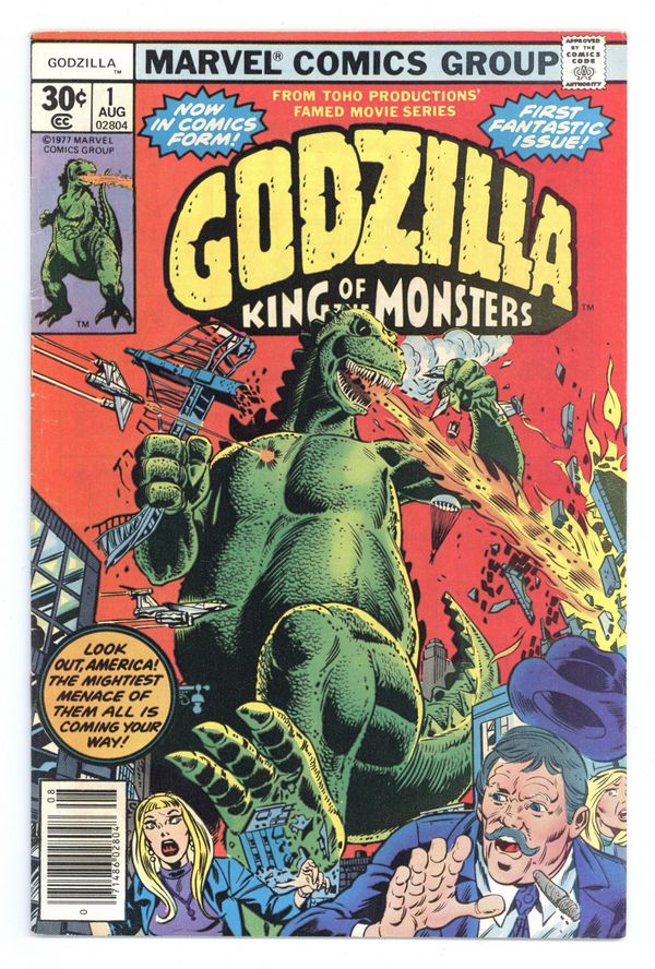 $60.00"The Coming!" Guest-starring Nick Fury and S.H.I.E.L.D. Story by Doug Moench. Art by Herb Trimpe and Jim Mooney. The slumbering leviathan known as Godzilla has awaken and rises out of the sea off the shores of Alaska. This reptilian titan has already left Japan devastated and now has made his way to America. With a tail that can smash mountains to dust and fiery breath born out of the Atomic Age, is there anything that can stop this monster's rampage? Right from the Toho Productions' famed movie series comes Godzilla, King of the Monsters. Cover price $0.30.