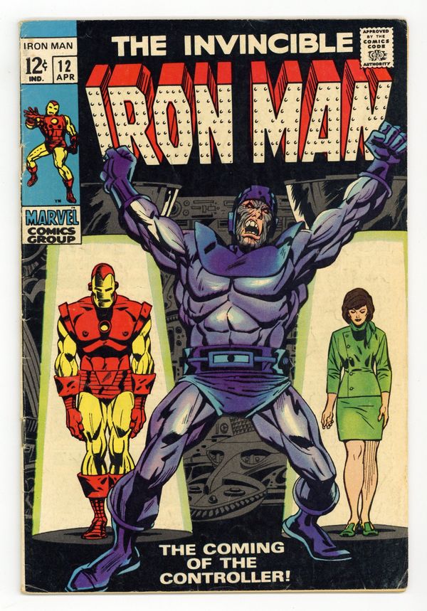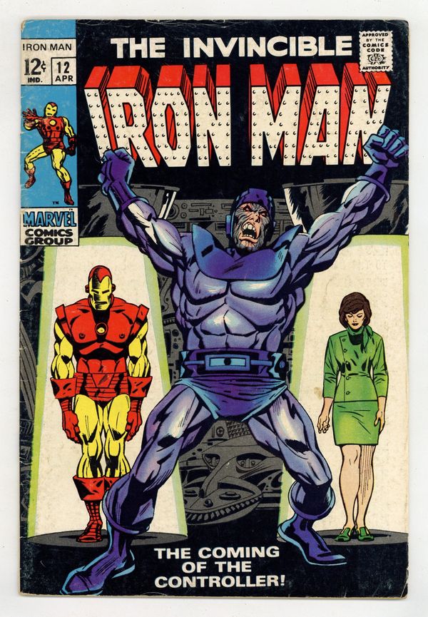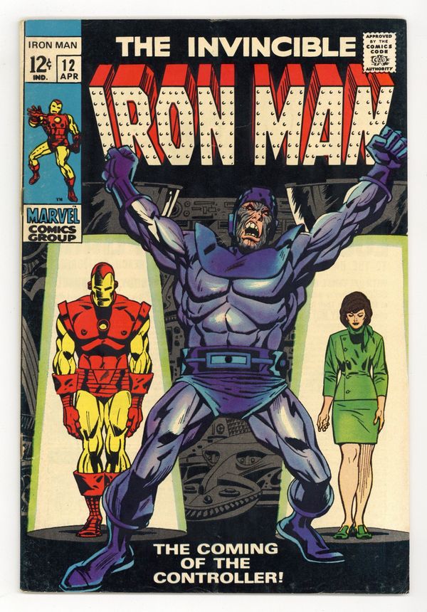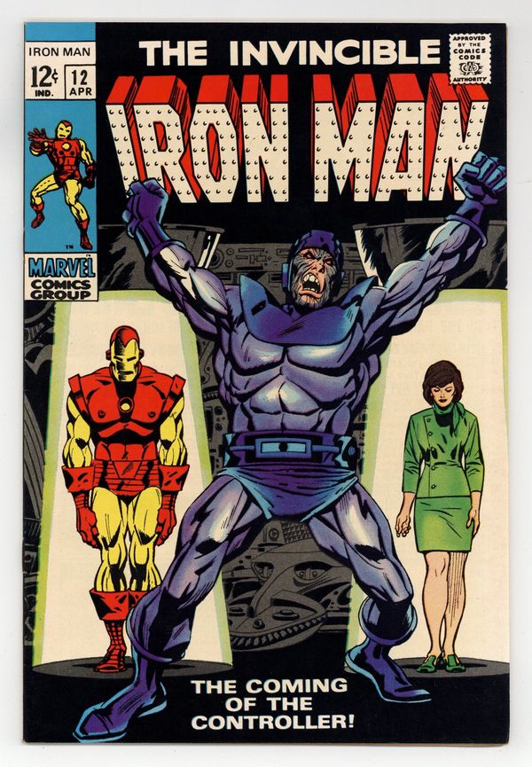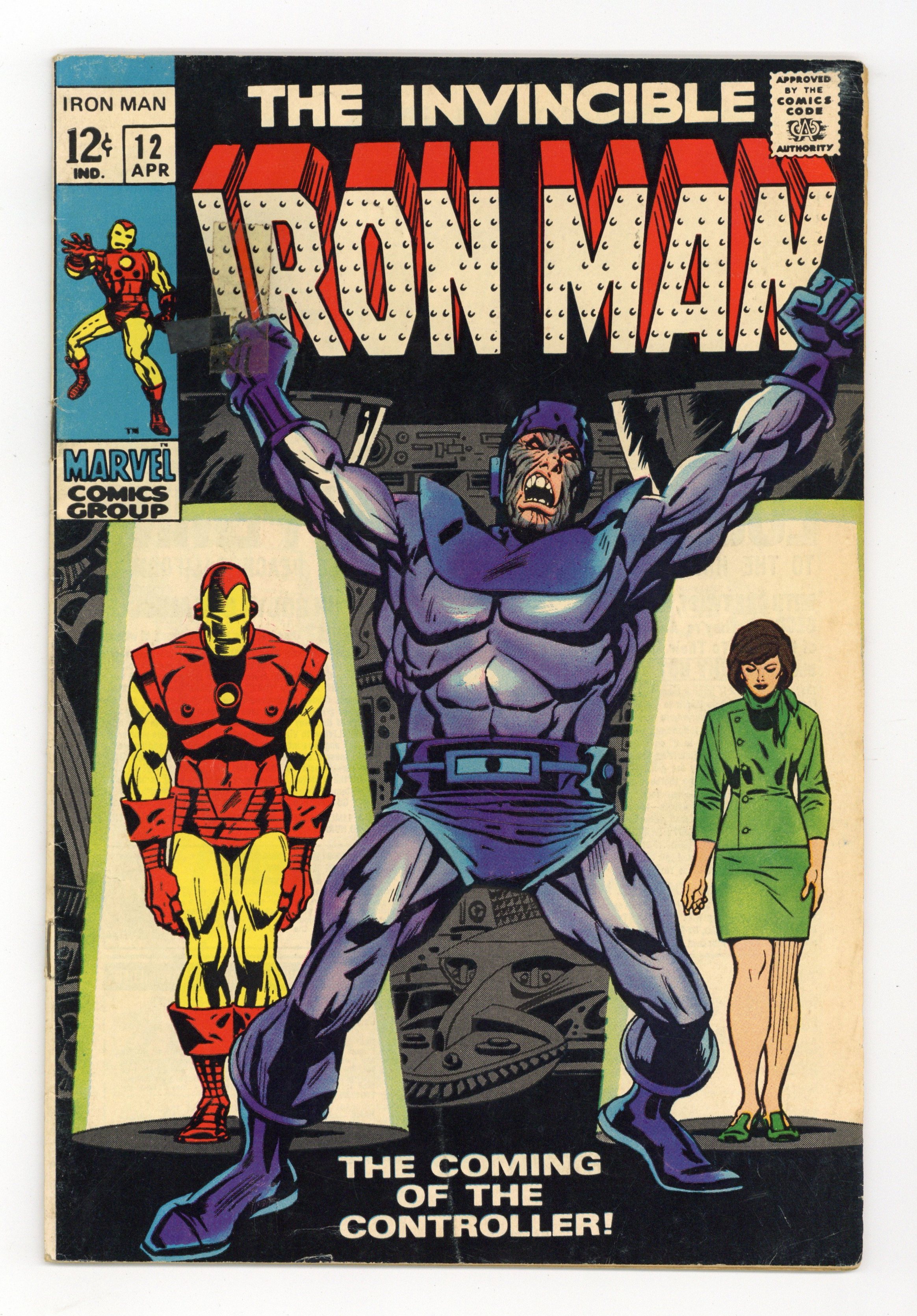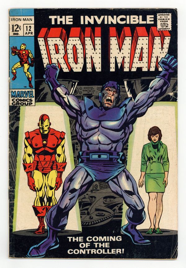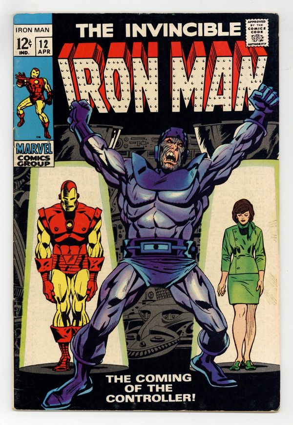 Tags: Marvel Legacy Numbering: Iron Man (part 12), Iron Man$23.50"The Coming of the Controller" Part 1 of 2. Script by Archie Goodwin. Pencils by George Tuska. Inks by Johnny Craig. Cover by George Tuska. A new twisted mastermind, Basil Sandhurst, has found a way to harness the power of the human brain! By using control discs, the evil villain has subjugated every person in a New England town. Tony Stark and Janice Cord are driving through that same town, and after they stop at a local restaurant...the Controller strikes! Meanwhile in the Everglades, Jasper Sitwell finds the wreck of Whitney Frost's escape ship from four issues ago. First appearance of the Controller. (Note: The letters page includes a letter from comics historian Peter Sanderson.) 32 pages Cover price $0.12.