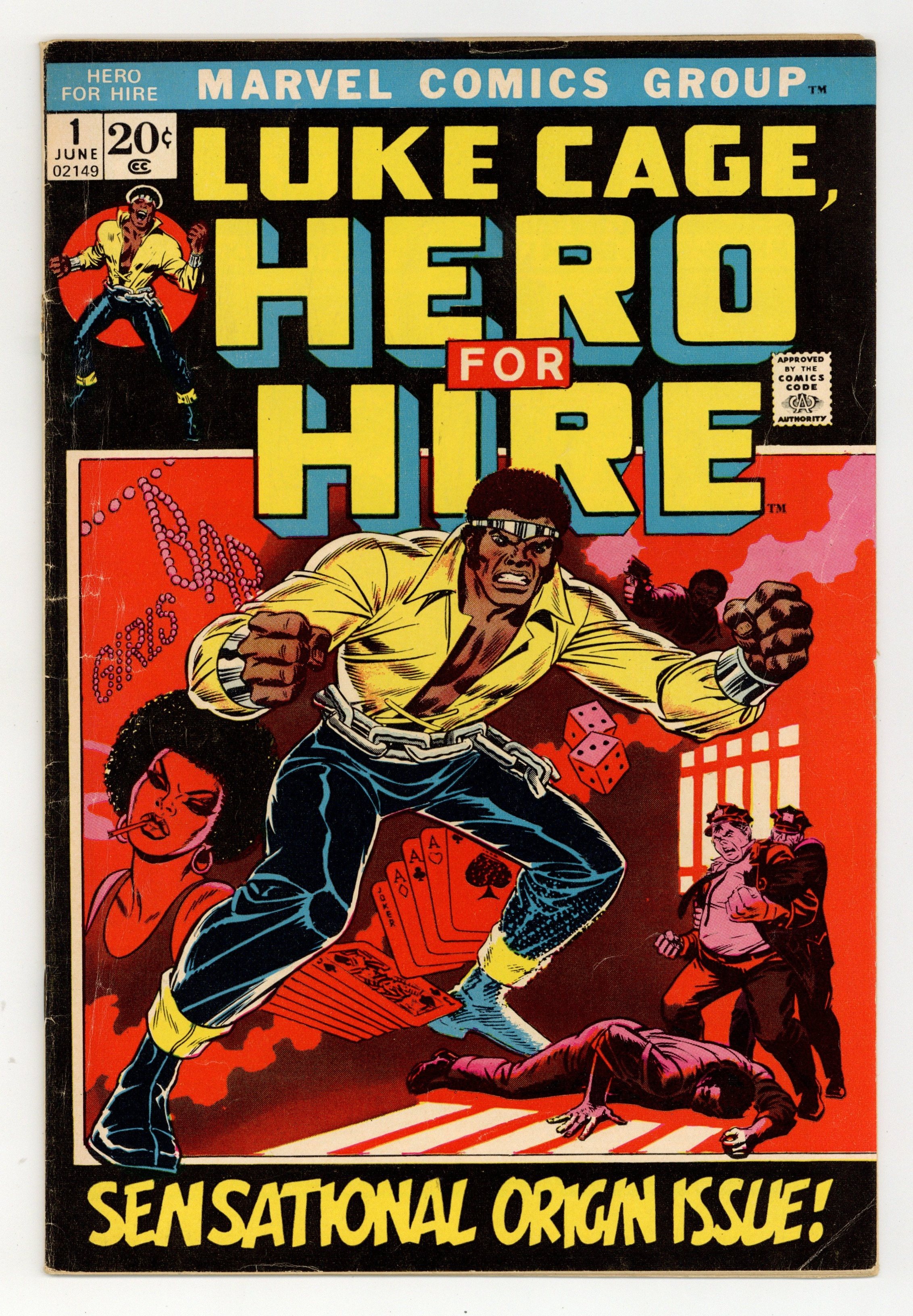 "Out of Hell--a Hero!" Script by Archie Goodwin, pencils by George Tuska, inks by Billy Graham. NOTE: Roy Thomas and John Romita are credited for their "considerable creative contributions." When Lucas, an innocent man, is sent to jail for a crime he did not commit, he decides he has nothing left to loose. Subjecting himself to unorthodox experiments, this inmate is endowed with great physical strength and nigh-unbreakable skin. No walls and bars on Earth can hold him. Now, as Luke Cage, he is known as the Hero for Hire, and he's here to clean up the "Mean Streets," one criminal at a time. Cover price $0.20.