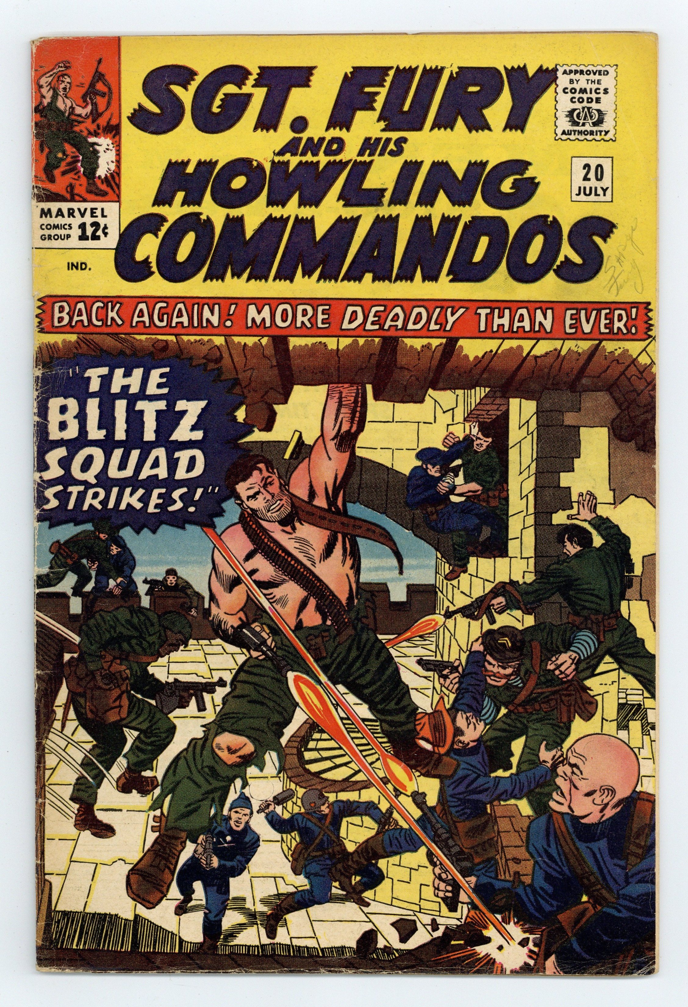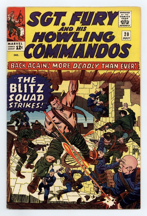 Cover pencils by Jack Kirby, inks by Frank Giacoia. "The Blitz Squad Strikes!", script by Stan Lee, pencils by Dick Ayers, inks by Frank Giacoia; Baron Strucker and his Blitzkrieg Squad takes control of a prison in Scotland; Fury and his men have to retake it. 36 pgs., full color. $0.12. Cover price $0.12.