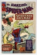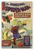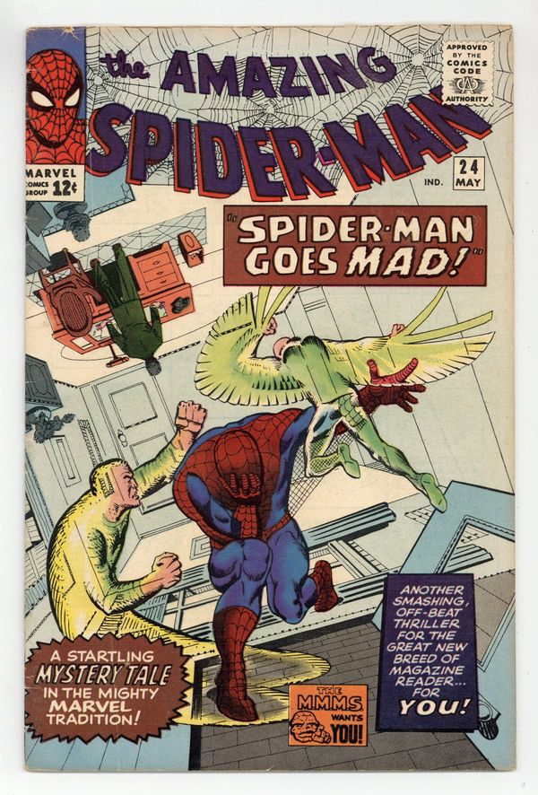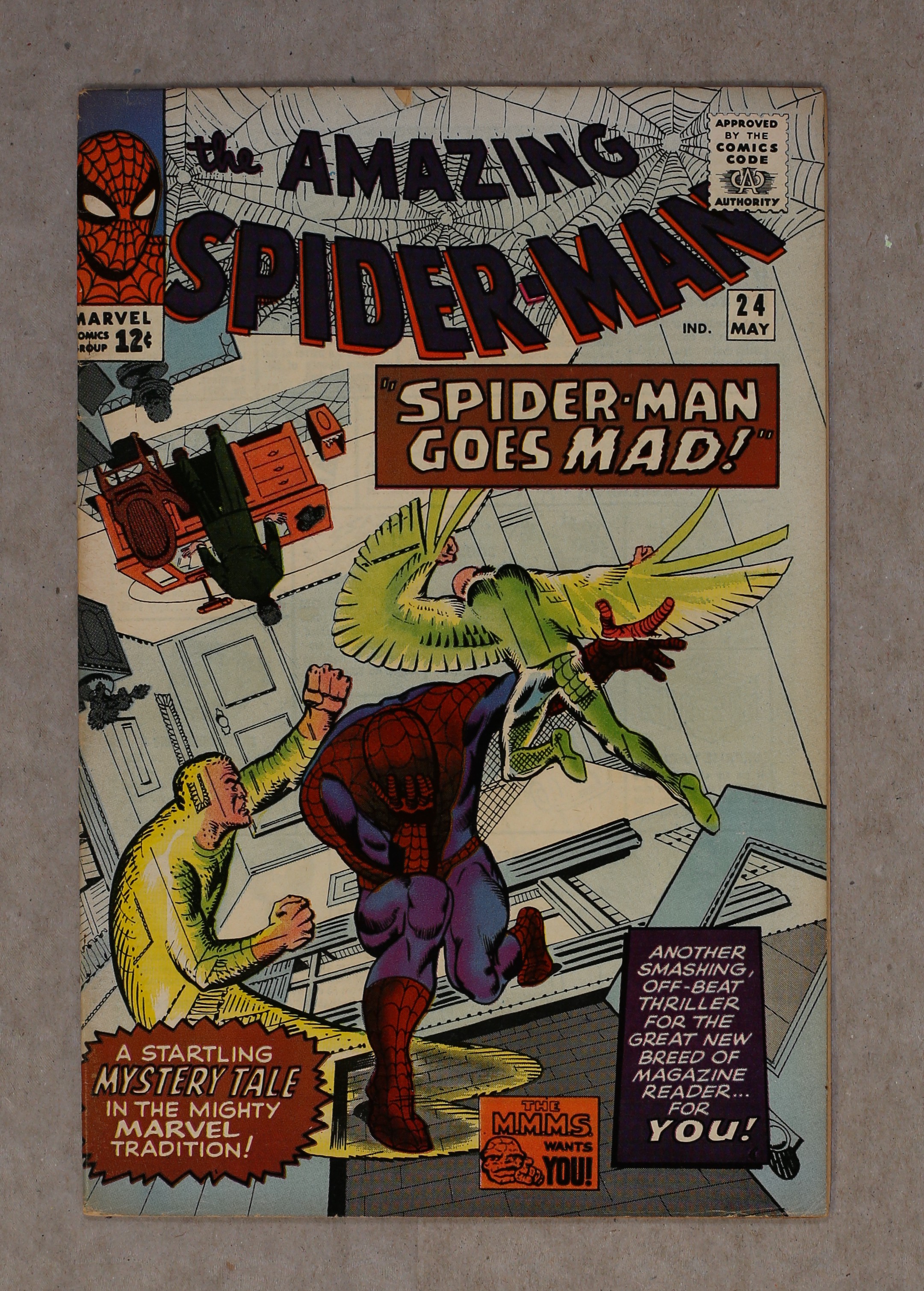 Spider-Man goes to see a psychiatrist! But it's really Mysterio messing with Spidey's mind in "Spider-Man Goes Mad." Script by Stan Lee, art and cover by Steve Ditko. Cameos (actually part of Spider-Man's imagination) by Doctor Octopus, the Vulture, and the Sandman. Reprinted in Marvel Tales # 19 and 162. Letters to the editor from comics writer Don McGregor and mycomicshop.com president Buddy Saunders! 36 pgs. Cover price $0.12.