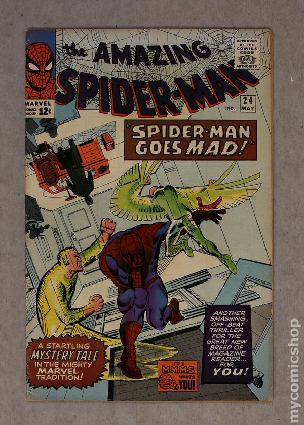 Starts Jan 3 Spider-Man goes to see a psychiatrist! But it's really Mysterio messing with Spidey's mind in "Spider-Man Goes Mad." Script by Stan Lee, art and cover by Steve Ditko. Cameos (actually part of Spider-Man's imagination) by Doctor Octopus, the Vulture, and the Sandman. Reprinted in Marvel Tales # 19 and 162. Letters to the editor from comics writer Don McGregor and mycomicshop.com president Buddy Saunders! 36 pgs. Cover price $0.12.