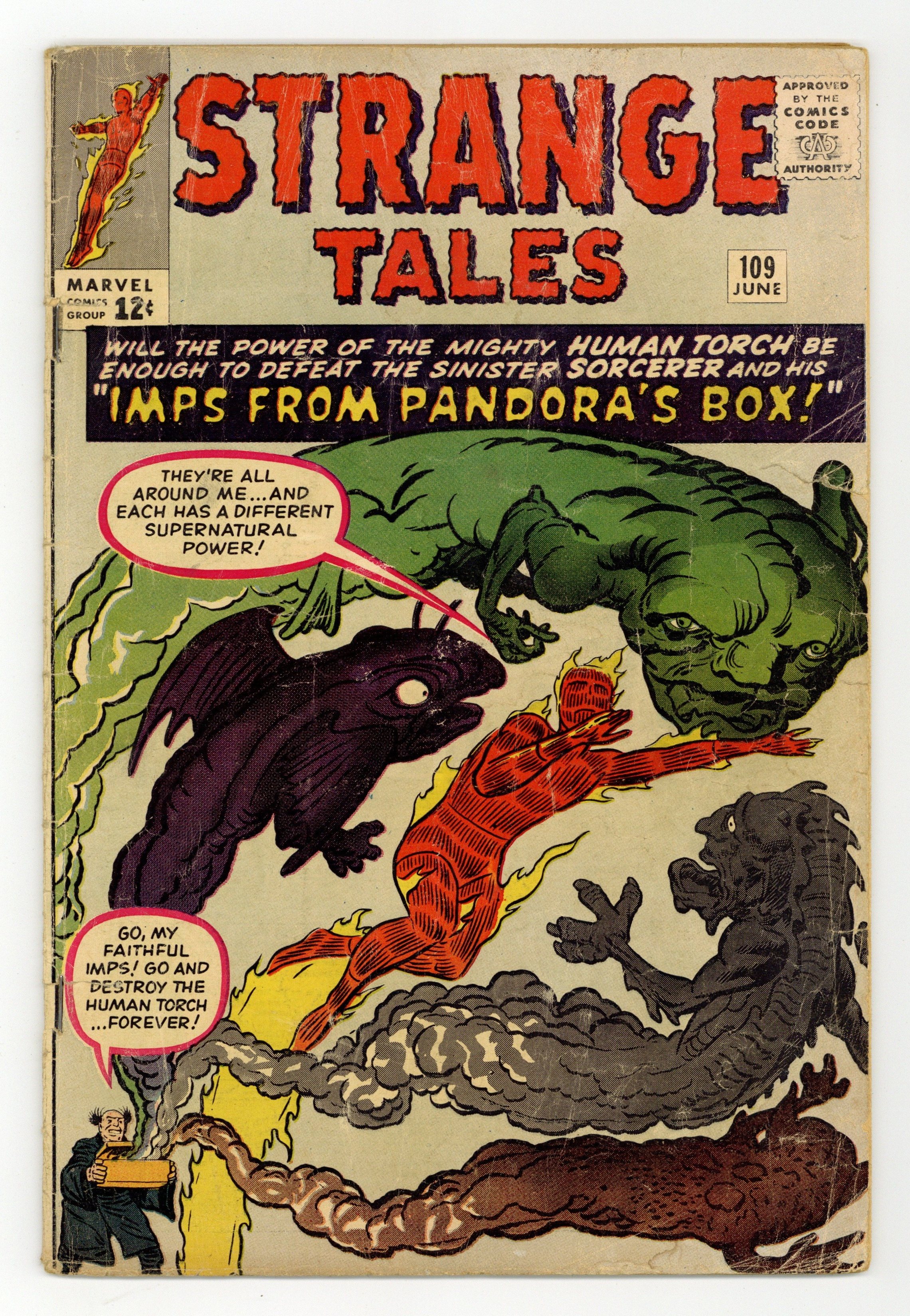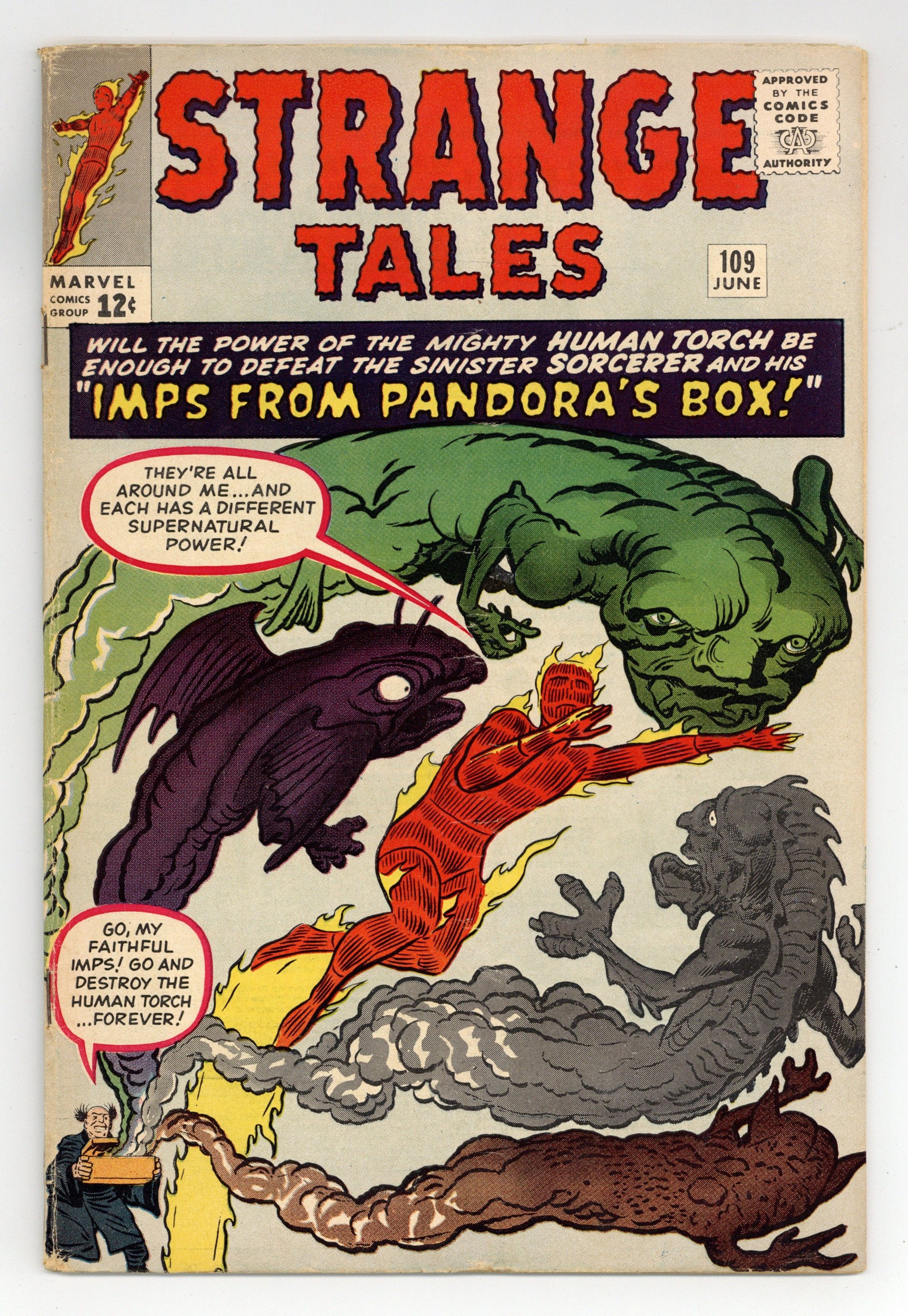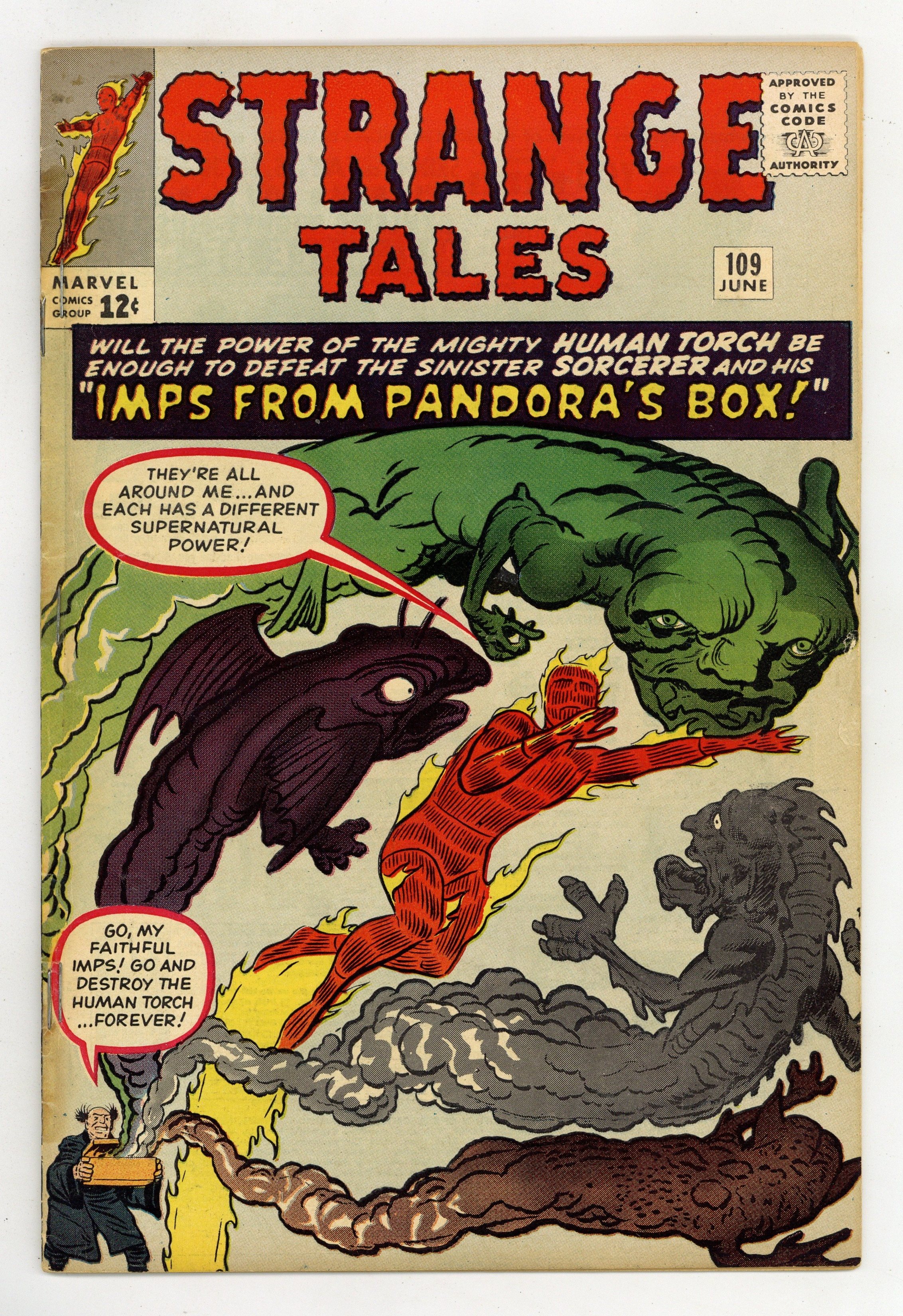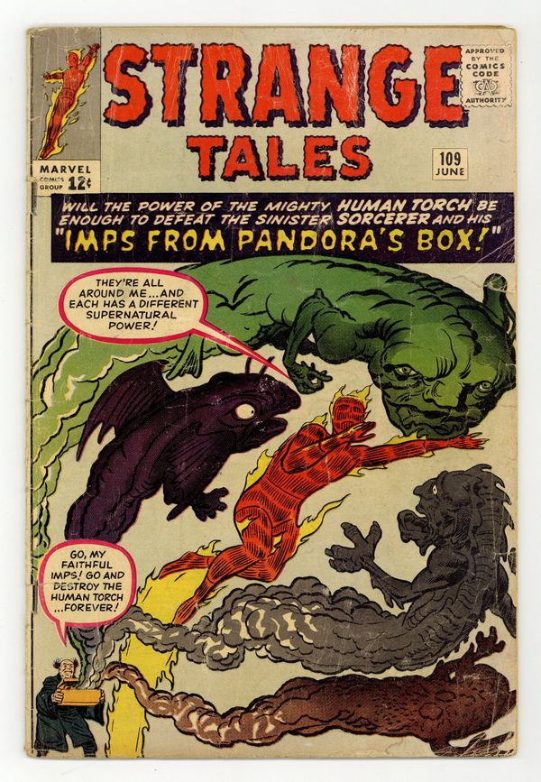 Cover pencils by Jack Kirby, inks by Dick Ayers. The Human Torch stars in "The Sorcerer and Pandora's Box," script by Stan Lee (plot) and Robert Bernstein [as R. Berns] (script), pencils by Jack Kirby, inks by Dick Ayers; The Human Torch fights a sorcerer that unleashes the evils imprisoned in Pandoras Box for his own profit; Fantastic Four guest appearance. "The Comic" text story. "Earth Is Off-Limits!", script by Stan Lee, art by Steve Ditko; Space explorers discover life on a far off planet, but mission control panics at the thought of alien germs loose on Earth and so forbids them to return. "Time Was...", script by Stan Lee (plot) and Larry Lieber (script), pencils by Larry Lieber, inks by Sol Brodsky; A scientist builds a time machine and travels to prehistoric times; When he kills an attacking caveman he unknowingly kills his own human ancestor, meaning that he becomes a Neanderthal. 36 pgs., full color. Cover price $0.12.