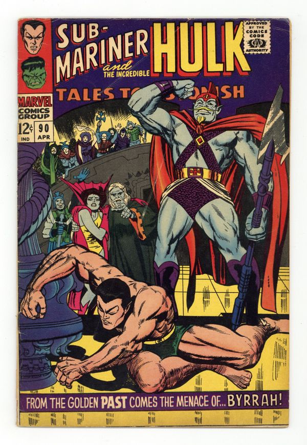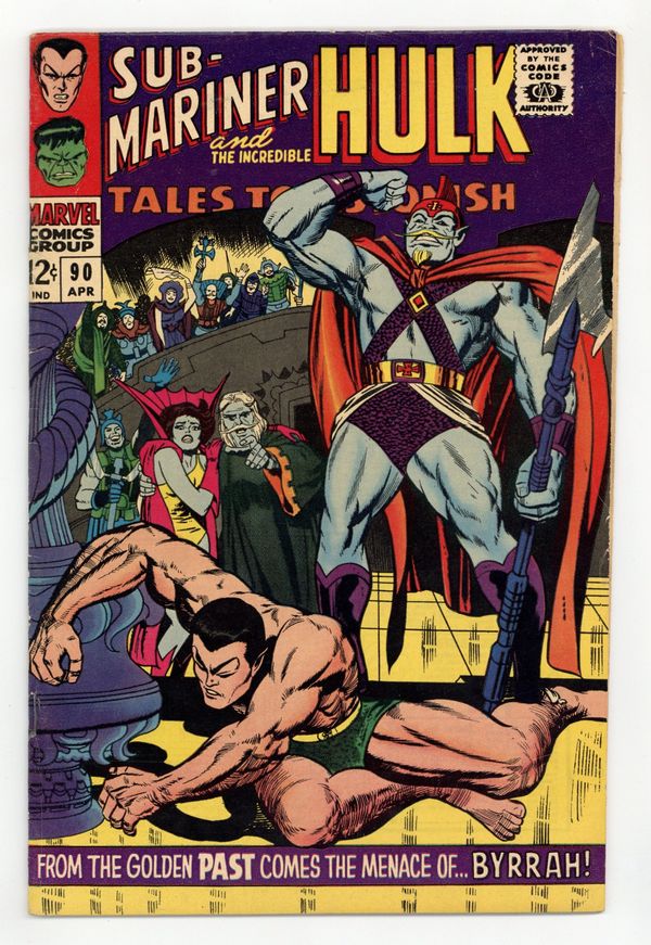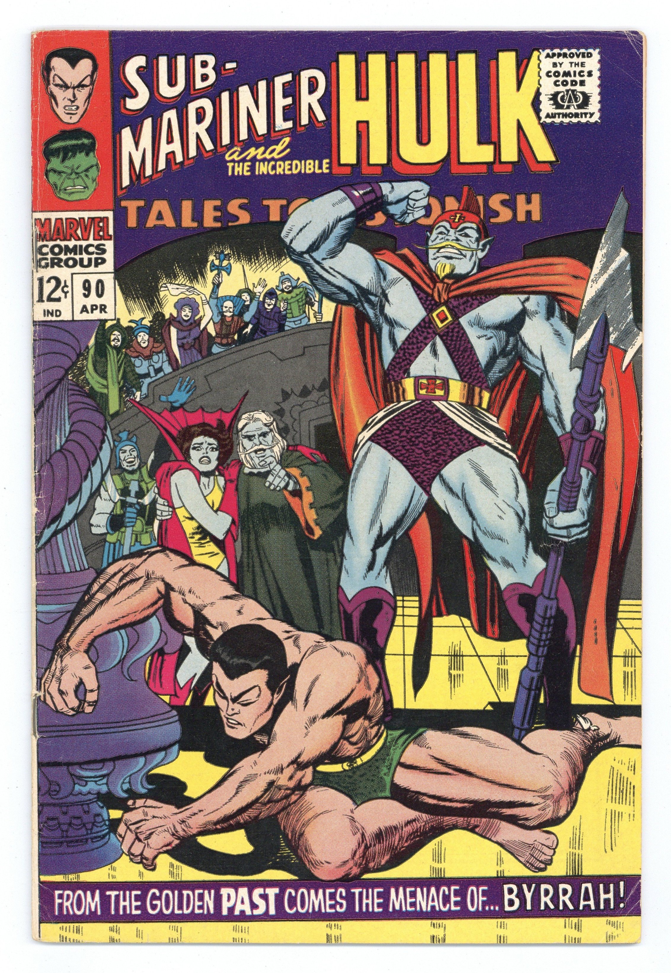 Cover by Jack Kirby and Vince Colletta. To Be Beaten by Byrrah!, script by Stan Lee, art by Bill Everett and Marie Severin; Namor's cousin wins the favor of the populace of Atlantis as well as the Atlantean council by belittling the regime of the Sub-Mariner as violent and unstable; He challenges Namor to single combat for the right to rule and no one is more surprised than the avenging son when his powers desert him during the fight and Byrrah handily wins. The Abomination!, script by Stan Lee, art by Gil Kane; The Stranger leaves earth with the rampaging Hulk left behind to wreak destruction on his behalf; Turning back into his alter ego, Banner surrenders himself to Gamma base and tries to kill himself with radiation to stop the Hulk's destruction; Stopped before he can use his gamma machine, the machine is instead used by a foreign spy who is transformed into the Abomination; More powerful than even the Hulk, Abomination beats the jade giant down and kidnaps Betty as he escapes from the base. Letter from Bill Mantlo. 36 pgs., full color. $0.12. Cover price $0.12.