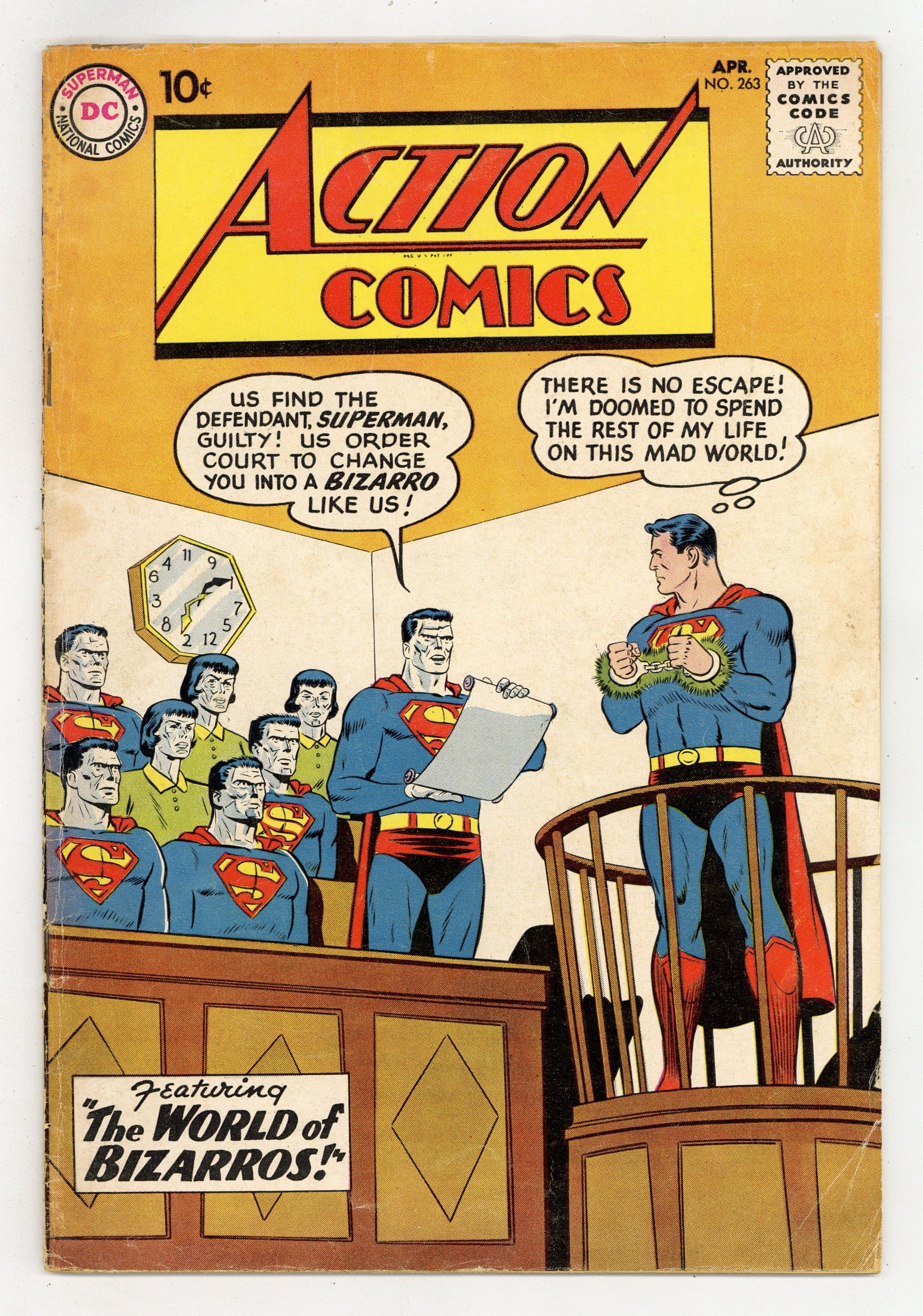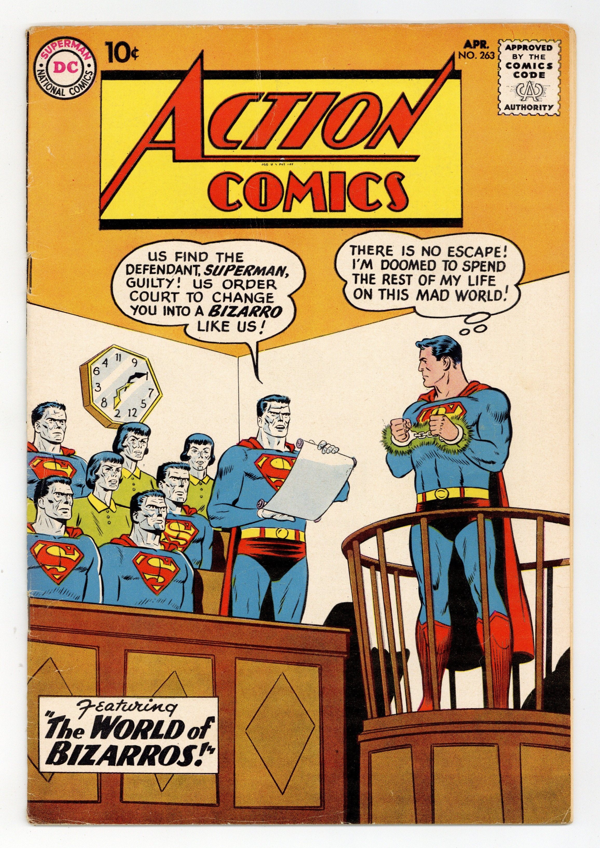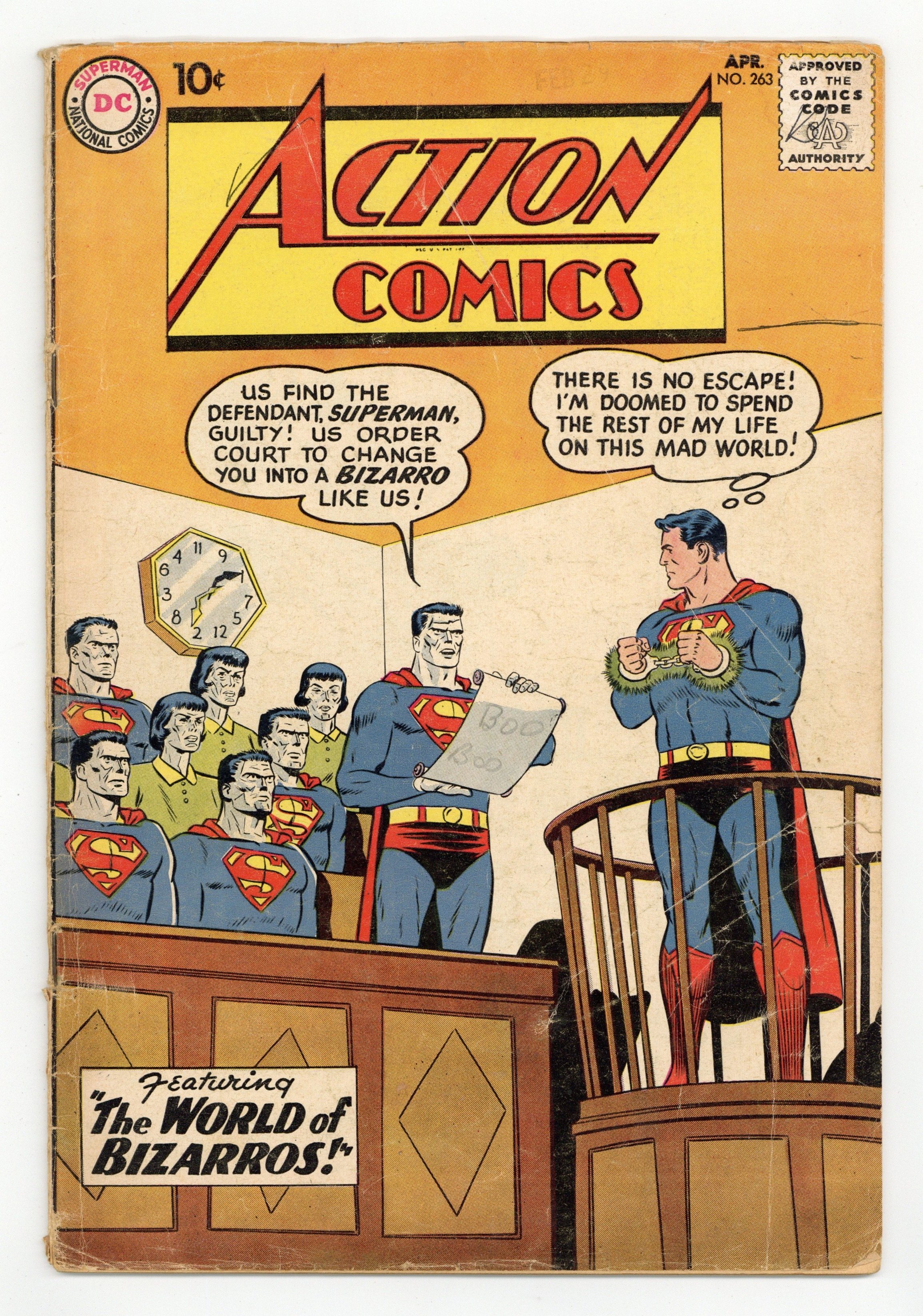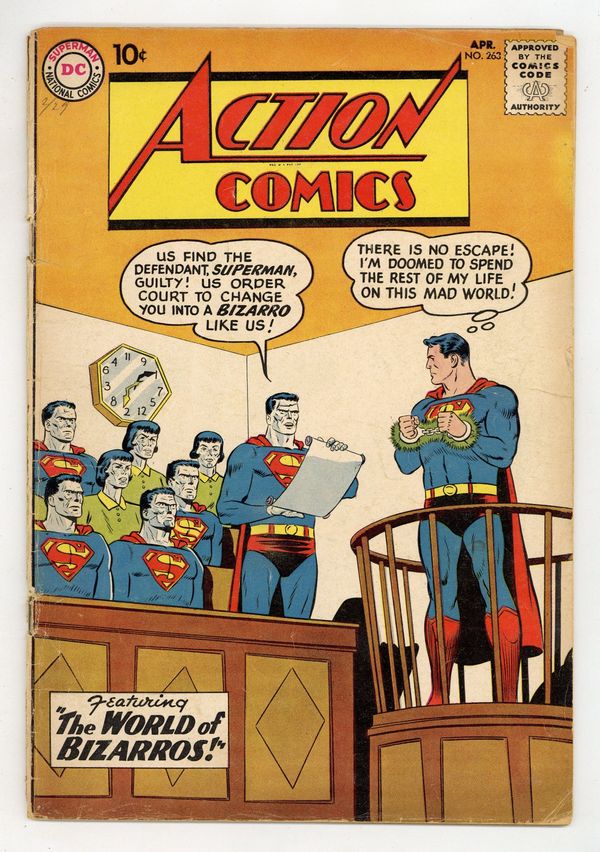 Cover pencils by Curt Swan, inks by Stan Kaye. "The World of Bizarros!", script by Otto Binder, pencils by Wayne Boring, inks by Stan Kaye; Bizarro and Bizarro-Lois move to another world which Bizarro populates with a duplicator ray; Superman visits and discovers Bizarros do everything backwards; Superman is sent to prison for violating the Bizarro code. 2/3-page Little Pete story by Henry Boltinoff. "Supergirl's Darkest Day!", script by Otto Binder, art by Jim Mooney; Supergirl rescues a boy with amnesia found lost at sea; He stays at the orphanage until Linda can figure out where he's really from. 36 Pages, Full Color. $.10 Cover price $0.10.