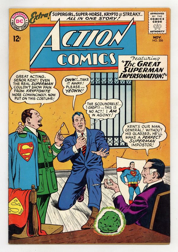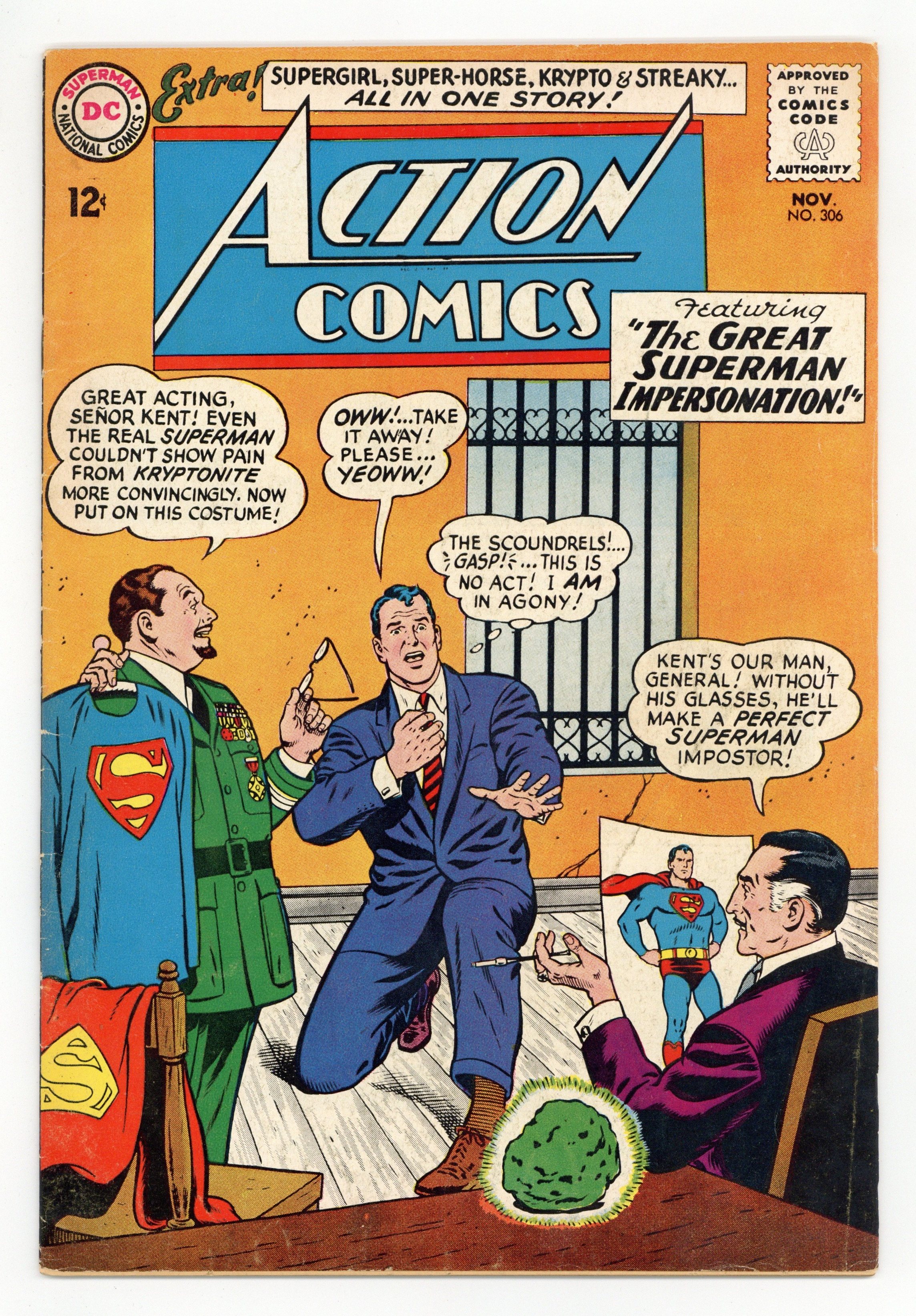 Cover pencils by Curt Swan, inks by George Klein. "The Great Superman Impersonation!", art by Al Plastino; Criminals from the South American country of El Salmado enlist Clark Kent to impersonate Superman as part of a plot to assassinate that country's president. The Flash ad. Supermen of America ad. One-page Homer story by Henry Boltinoff. "The Maid of Doom!", script by Leo Dorfman, art by Jim Mooney; Supergirl believes that she has been poisoned by radiation which causes death for any super-being she touches, so she agrees to be exiled to the Phantom Zone. 36 Pages, Full Color. $0.12 Cover price $0.12.