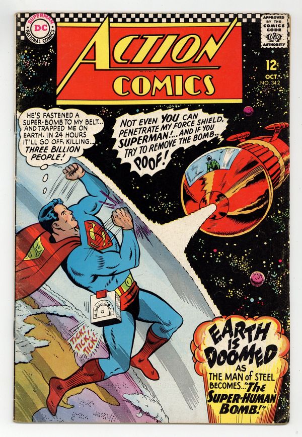 Tags: Superman$16.25Cover pencils by Curt Swan, inks by George Klein. Batman movie ad. "The Super-Human Bomb!", script by Jim Shooter, art by Wayne Boring; Interplanetary criminal Grax defeats Brainiac, then travels to Earth where he uses Brainiac's force-field to trap Superman on Earth, then attaches a super-powerful bomb to him which will destroy the planet. Plastic Man ad. "The Day Supergirl Became an Amazon!", script by Otto Binder, art by Jim Mooney; Linda Danvers and two of her college classmates are shipwrecked on a South Pacific island inhabited by a tribe of Amazon warriors. Writer Mark Evanier gets mentioned in the letter's column. 36 Pages, Full Color. $0.12 Cover price $0.12.