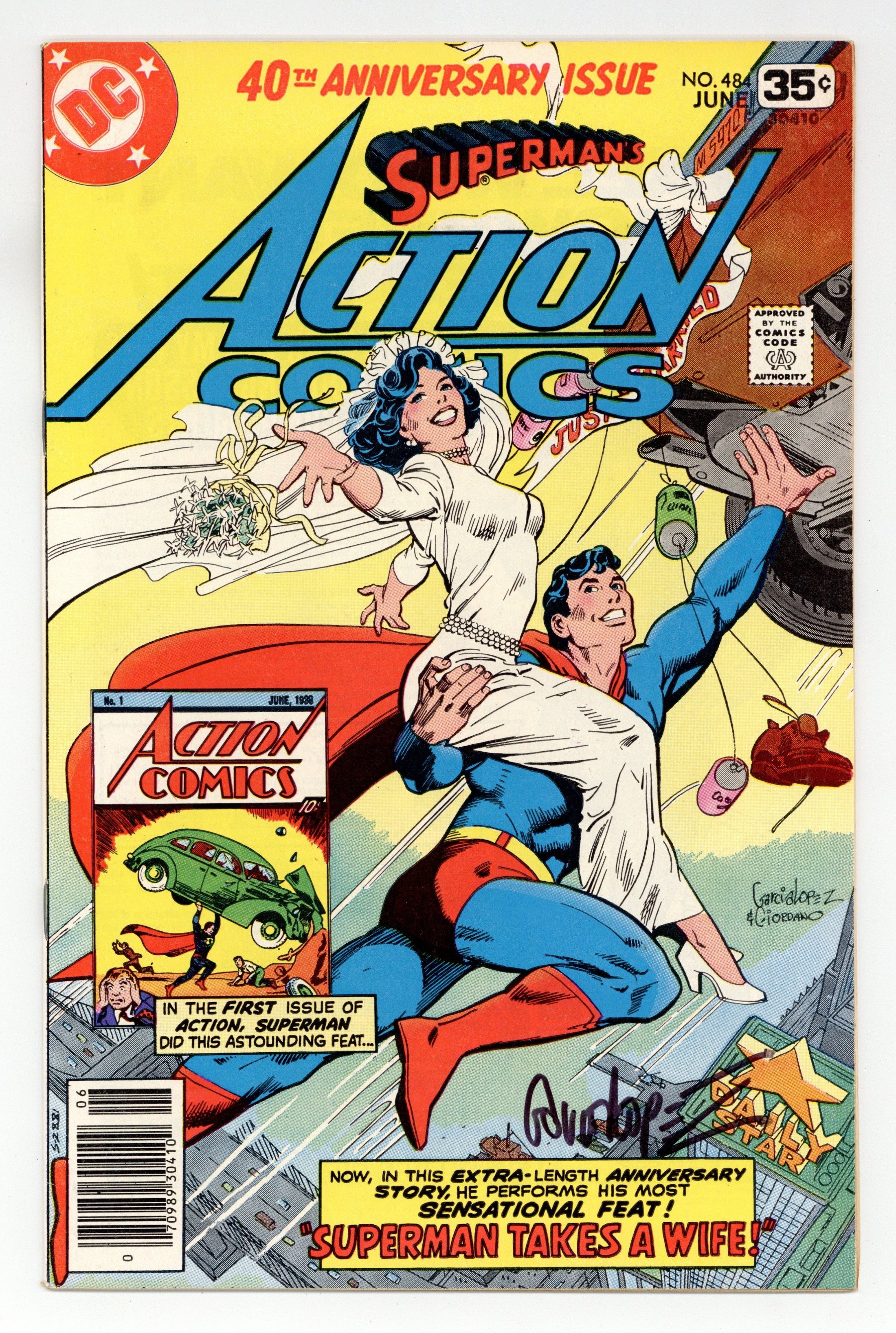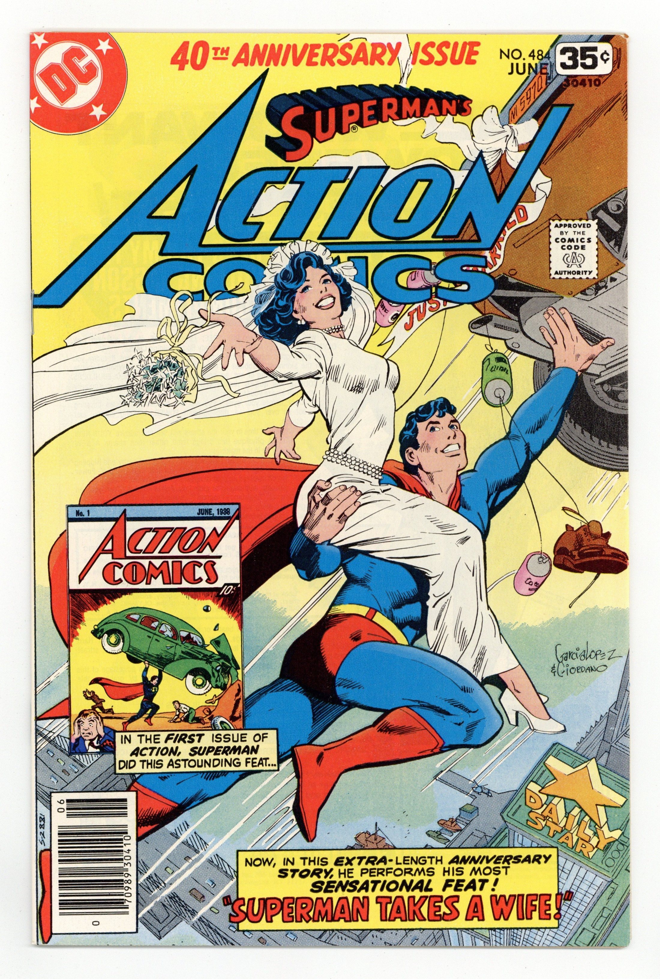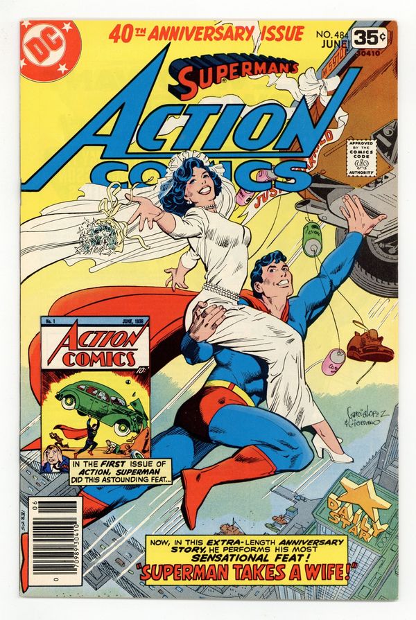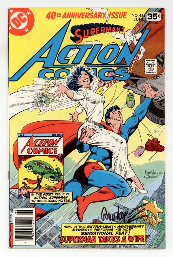 Tags: Superman$17.25Cover art by Jose Luis Garcia-Lopez and Dick Giordano. Superman Takes a Wife, script by Cary Bates, pencils by Curt Swan, inks by Joe Giella; Colonel Future and The Wizard team to prevent the existence of Earth 2 Superman, who eventually restates his marriage vows with Lois; 40th anniversary issue. 36 Pages, Full Color. Cover price $0.35.