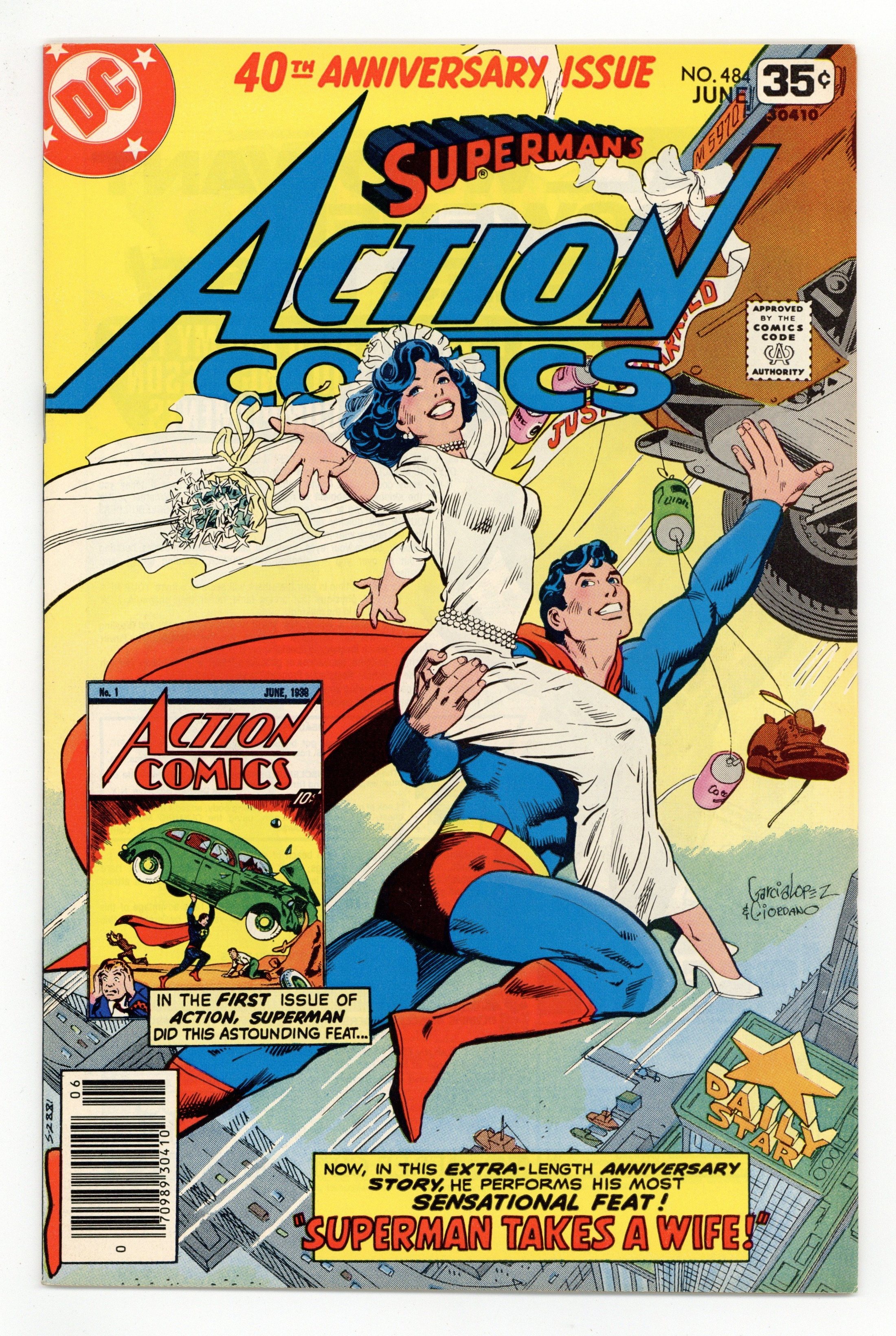 Cover art by Jose Luis Garcia-Lopez and Dick Giordano. Superman Takes a Wife, script by Cary Bates, pencils by Curt Swan, inks by Joe Giella; Colonel Future and The Wizard team to prevent the existence of Earth 2 Superman, who eventually restates his marriage vows with Lois; 40th anniversary issue. 36 Pages, Full Color. Cover price $0.35.