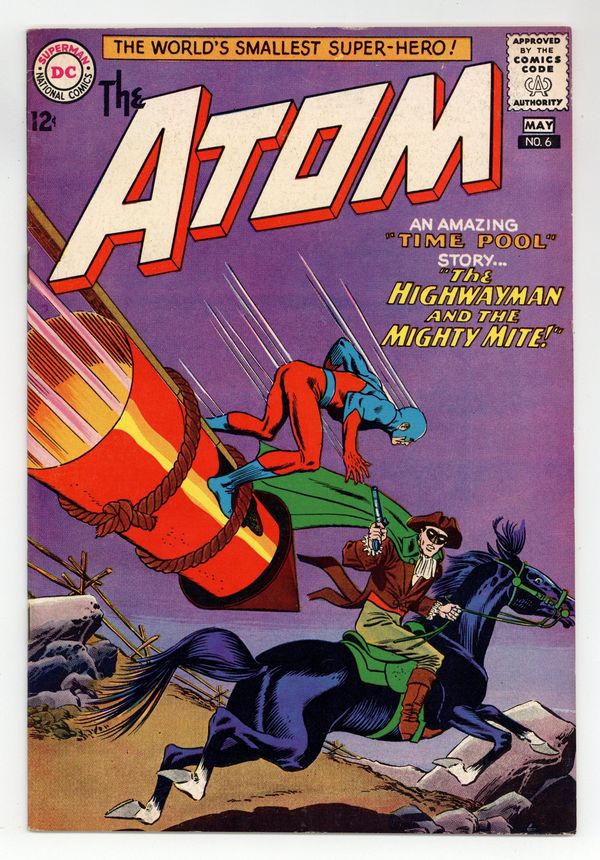 Cover pencils by Gil Kane, inks by Murphy Anderson. "The Riddle of the Two-Faced Astronaut!", script by Gardner Fox, pencils by Gil Kane, inks by Murphy Anderson; Ray Palmer's old friend Wizardo uses an assistant dressed as an astronaut in his magic act, but when it appears that the astronaut is using the magic act as a cover for burglary the Atom must figure out the truth. Green Lantern ad. "The Highwayman and the Mighty Mite!", script by Gardner Fox, pencils by Gil Kane, inks by Murphy Anderson; The Atom travels through Professor Hyatt's Time Pool to the year 1739. where he learns that an ancestor of his was the notorious highwayman Dick Turpin. Strange Sports Stories ad. Letter to the editor from MyComicShop owner Buddy Saunders. 36 pgs., full color. $0.12. Cover price $0.12.