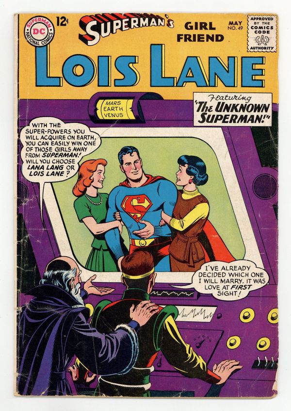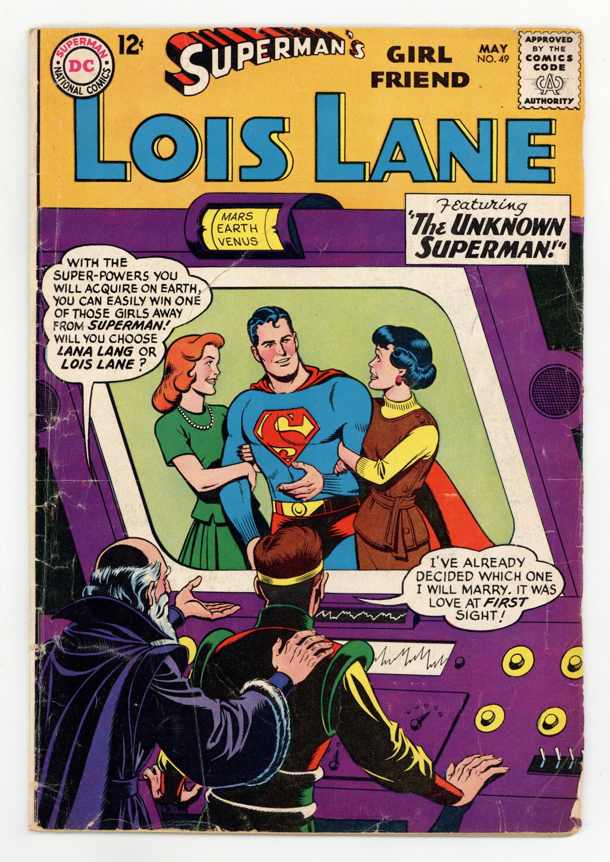 Cover art by Kurt Schaffenberger. The Unknown Superman! (Part I), art by Kurt Schaffenberger; Dr. Drolic has a machine that will find the greatest unknown person in a given category. Lois uses it to find the greatest unknown super-person which leads her to Strong Bear. Varsity Vic humor page by Henry Boltinoff. The Secret of Strong Bear! (Part II); Lois learns the truth about Strong Bear. House ad for Capt. Storm #1. Lois Lane, Beauty Queen!, pencils by John Forte, inks by George Klein; Lois Lane enters a beauty contest to try to get an interview with Rex Koven, a burglar-alarm manufacturer serving as a contest judge. 36 Pages, Full Color. Cover price $0.12.