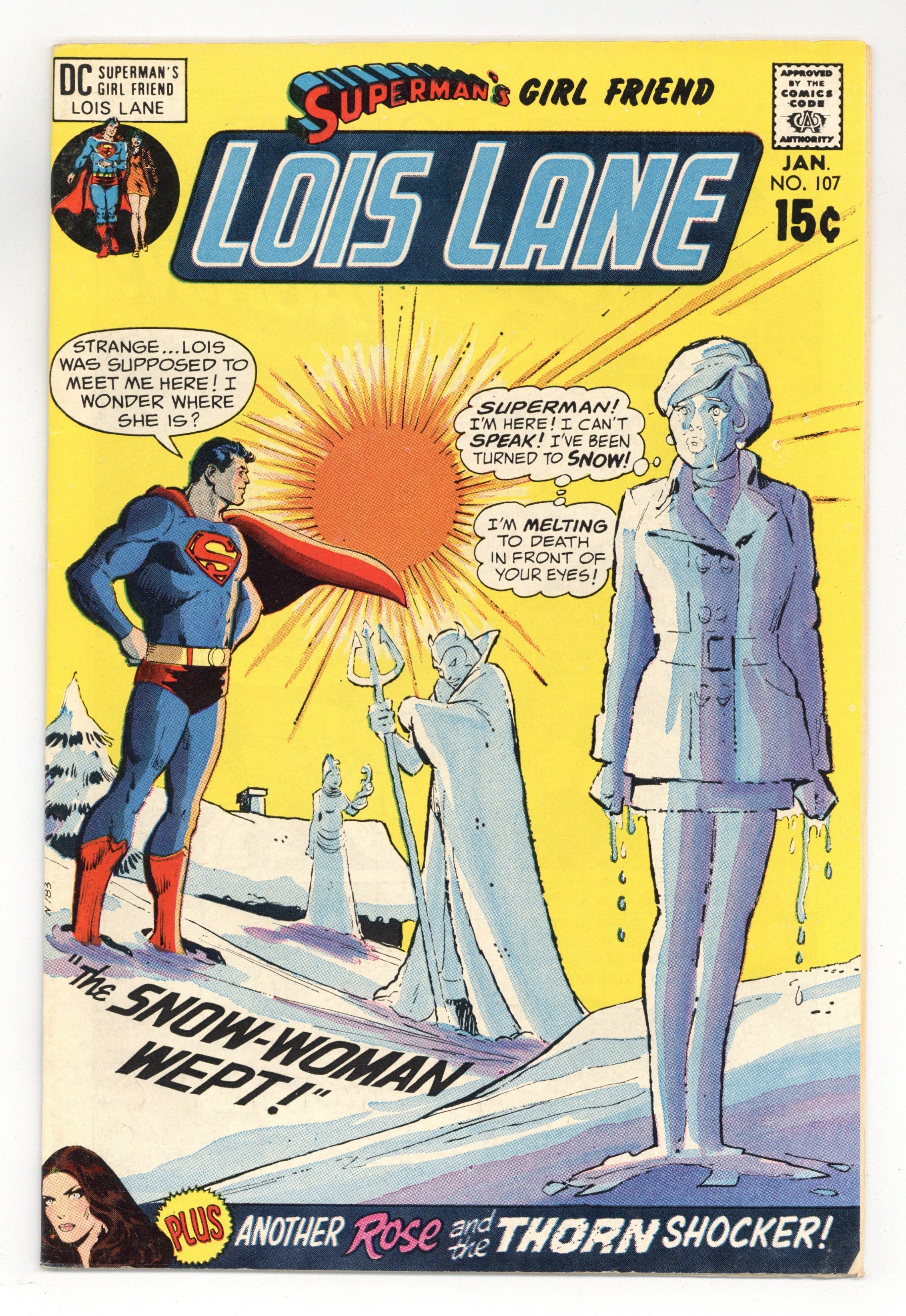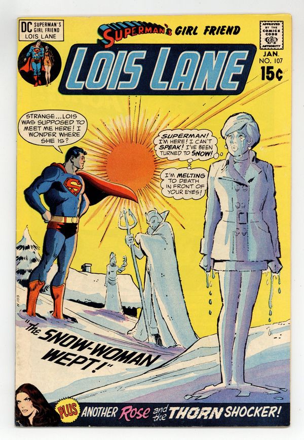 Cover art by Dick Giordano. The Snow-Woman Wept!, script by Robert Kanigher, pencils by Werner Roth, inks by Vince Colletta; Professor Bridnell has an invention that should allow people to breathe underwater, but when used on Lois Lane, it causes her to turn into a snow sculpture. Promo for Superman and Superman related titles, art by Neal Adams. My Executioner Loves Me, script by Robert Kanigher, pencils by Ross Andru, inks by Mike Esposito; When Beau Benton tries to kill Thorn for the 100, she saves him from drowning and he falls in love with her. 36 Pages, Full Color. Cover price $0.15.