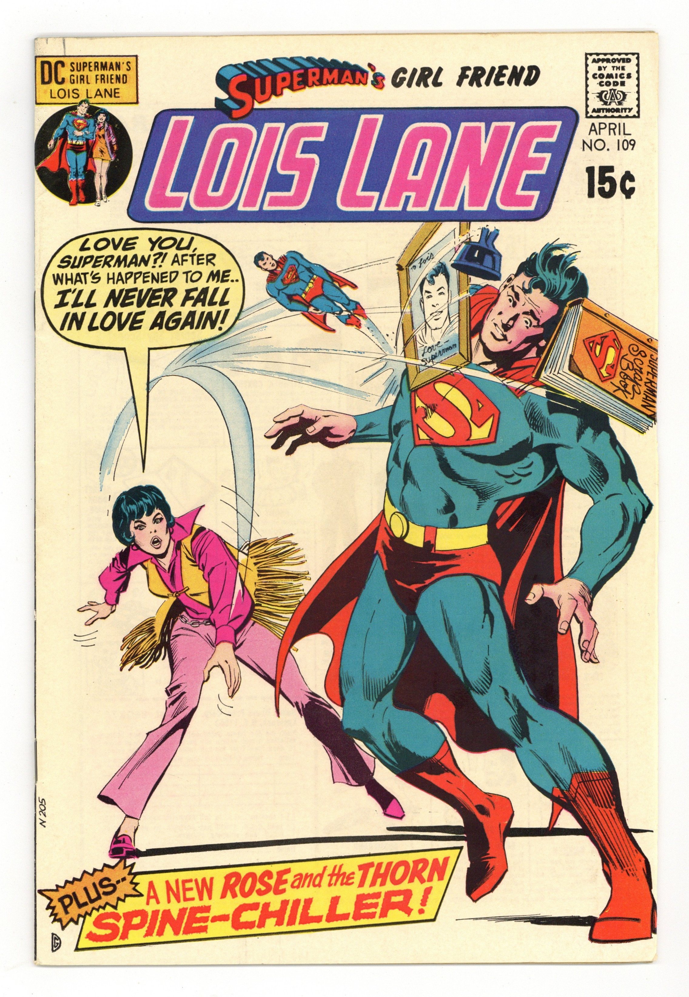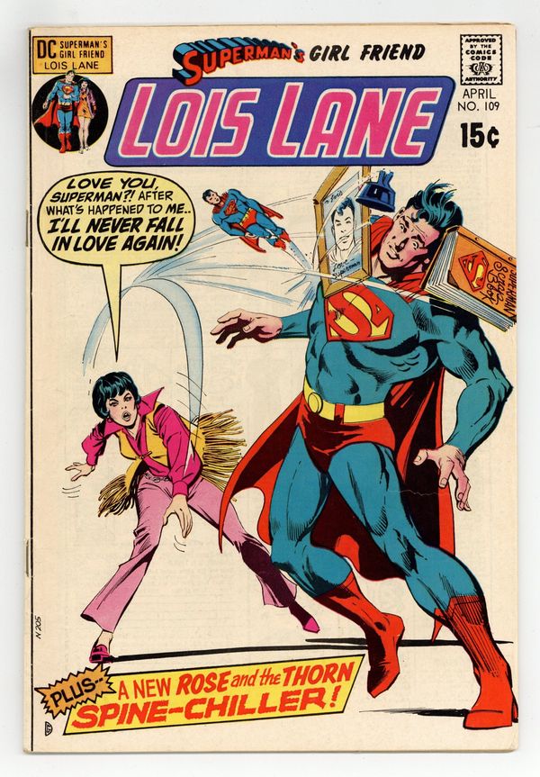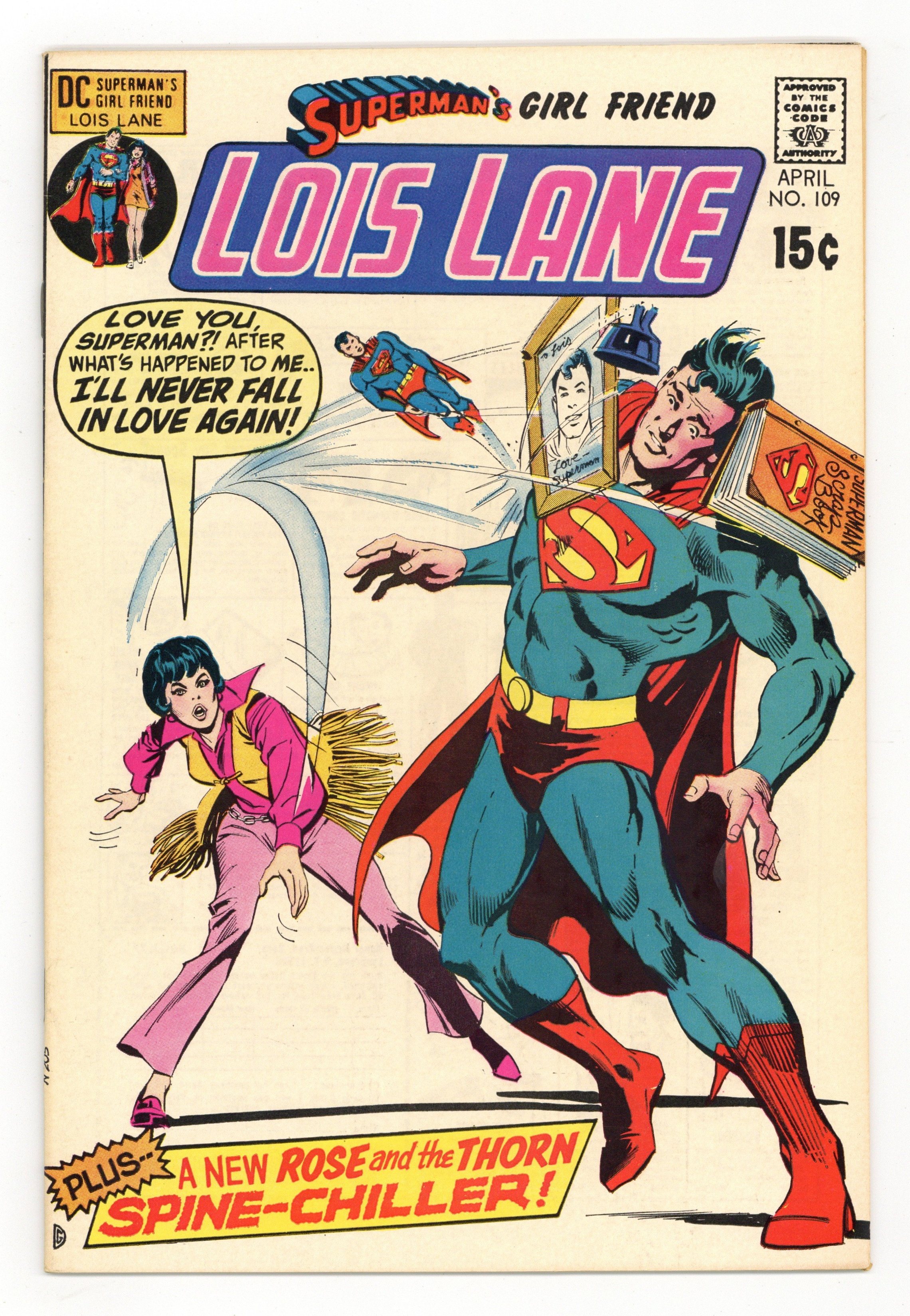 Cover art by Dick Giordano. I'll Never Fall in Love Again!, script by Cary Bates, pencils by Werner Roth, inks by Vince Colletta and Murphy Anderson (Superman heads); Professor Denison captures Lois and gives her an "emotional lobotomy" so she will no longer love Superman. The Mask of Death!, script by Robert Kanigher, pencils by Ross Andru, inks by Mike Esposito; Rose finds out the story of Selena Mason, an actress who was disfigured by a gangster from Selena's past. 36 Pages, Full Color. Cover price $0.15.